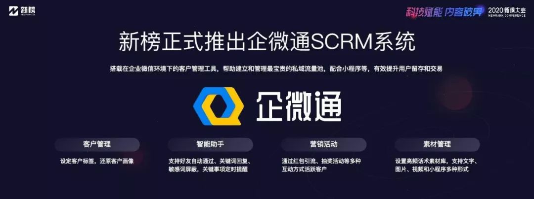 私域流量這一概念讓無數(shù)企業(yè)看到發(fā)展的新機(jī)遇,但同時(shí)很多人對概念的理解也容易走向偏狹,比如只把流量當(dāng)流量,忘記背后是真實(shí)有生命的用戶。當(dāng)下眾多私域玩法還在“野蠻生長”,企業(yè)需要一套系統(tǒng)性的認(rèn)知與打法。在本篇文章中您將看到: 1、企業(yè)當(dāng)下的流量焦慮以及新的傳播紅利; 2、流量的本質(zhì)以及私域的價(jià)值所在; 3、經(jīng)營好私域流量的三個(gè)關(guān)鍵點(diǎn); 4、新榜能為企業(yè)私域運(yùn)營提供什么? 1月7日,新榜聯(lián)合創(chuàng)始人李建偉在2020新榜大會發(fā)表了題為《我拿你當(dāng)私域流量,也拿你當(dāng)朋友》的演講,并推出搭載在企業(yè)微信環(huán)境之下的企微通SCRM產(chǎn)品,配合小程序,幫助企業(yè)建立和管理私域流量池,有效提升用戶留存和轉(zhuǎn)化。 以下內(nèi)容整理自現(xiàn)場演講,經(jīng)由嘉賓本人確認(rèn):