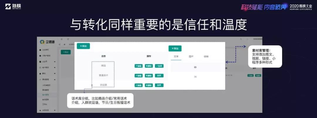 這一頁是企微通的話術(shù)庫和素材庫,話術(shù)庫涵蓋產(chǎn)品介紹、入群歡迎語、節(jié)日/生日祝福等,素材庫支持圖文、視頻、鏈接、小程序等多種形式,這些細(xì)節(jié)的標(biāo)準(zhǔn)化,都是為了通過專業(yè)服務(wù)加深與客戶的信任關(guān)系,體現(xiàn)企業(yè)的溫度。