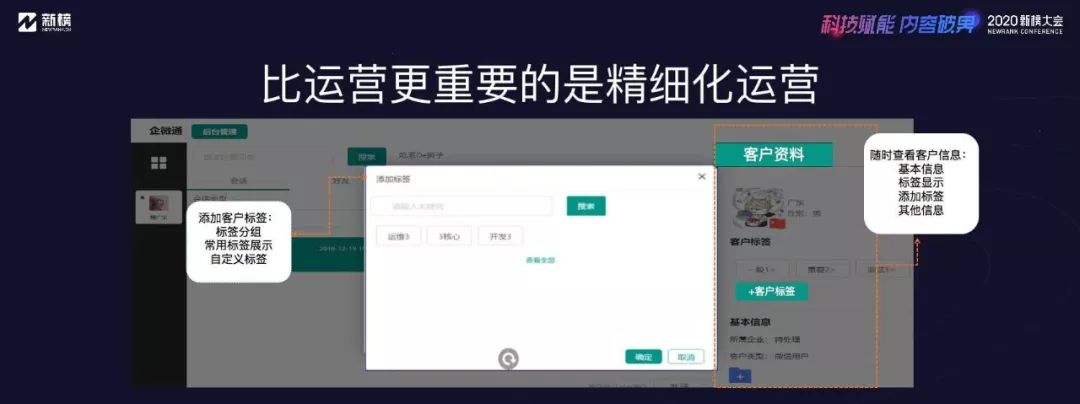 這一頁展示的是企微通打標(biāo)簽和事件提醒功能:企業(yè)員工添加客戶之后,了解客戶情況與需求,為客戶創(chuàng)建標(biāo)簽,比如今天客戶向企業(yè)員工買了一瓶香薰,三個(gè)月后系統(tǒng)會自動提醒員工,客戶的香薰快用完了,員工就可以給客戶發(fā)送消息:您的香薰快用完了吧,我們還有其他款也不錯,要不要試一下?同時(shí),企業(yè)員工可以隨時(shí)查看該用戶的其他標(biāo)簽,再發(fā)送適宜的話術(shù)與商品,來拉近和客戶之間的關(guān)系。