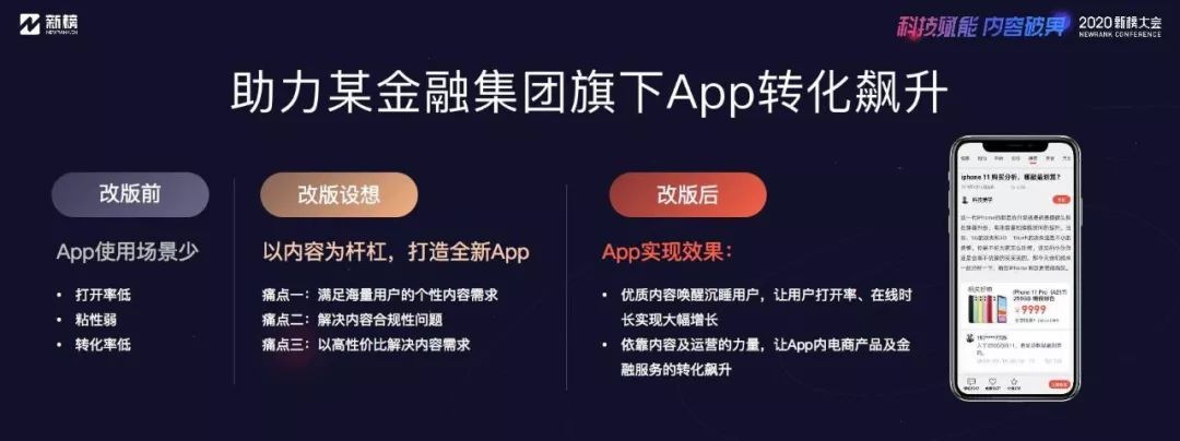 以內(nèi)容云協(xié)助某大型金融集團(tuán)旗下App改版為例。改版前App存在打開率低、用戶粘性弱、轉(zhuǎn)化率低等常見的問題,我們設(shè)想以內(nèi)容為杠桿,來提高App的打開率和用戶粘性,滿足用戶對內(nèi)容的個(gè)性化需求。改版后內(nèi)容更加多樣化,而且都是來自于新媒體頭部大號,他們不僅內(nèi)容優(yōu)質(zhì),本身就擁有龐大的粉絲基礎(chǔ)。但不是所有大號的內(nèi)容都適合,我們協(xié)助企業(yè)搭建的這個(gè)內(nèi)容社區(qū),是根據(jù)企業(yè)的品牌定位和目標(biāo)受眾,對內(nèi)容進(jìn)行篩選和匹配的。企業(yè)需要面向一二線城市青年的吃喝玩樂內(nèi)容,以適應(yīng)App所承載的消費(fèi)場景,例如在新手機(jī)發(fā)布前后,我們會策劃推送手機(jī)相關(guān)的熱點(diǎn)專題,在頁面中鏈接App商城中的手機(jī)商品,以內(nèi)容促進(jìn)購買。依靠內(nèi)容和運(yùn)營的力量,App內(nèi)電商產(chǎn)品和金融服務(wù)的轉(zhuǎn)化飆升,2019年雙11當(dāng)天的交易額達(dá)到2018年同期的6倍多。同時(shí),這些私域用戶是企業(yè)可以直接觸達(dá)的,用戶的點(diǎn)擊、評論、轉(zhuǎn)發(fā)、閱讀時(shí)長等行為都可以被記錄,有助于企業(yè)獲取更清晰的用戶畫像。