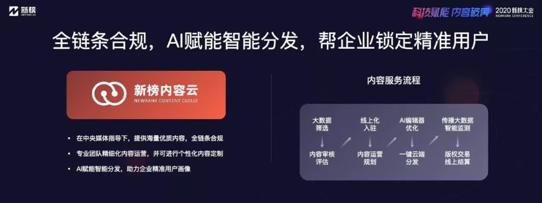 針對企業(yè)的上述痛點(diǎn),新榜推出了內(nèi)容云服務(wù),以有版權(quán)的、安全的優(yōu)質(zhì)內(nèi)容為杠桿,為企業(yè)提供精細(xì)化內(nèi)容運(yùn)營。內(nèi)容云接受中央媒體指導(dǎo),聯(lián)手多家主流內(nèi)容平臺,保障導(dǎo)向安全;與超過1.2萬家內(nèi)容創(chuàng)作機(jī)構(gòu)一對一簽署協(xié)議,與多個(gè)圖片庫、視頻庫深度戰(zhàn)略合作,保障版權(quán)安全;以此為基礎(chǔ),對海量優(yōu)質(zhì)內(nèi)容進(jìn)行精細(xì)化編輯和運(yùn)營,全天候響應(yīng),還可以按需定制;并依托新榜的技術(shù)優(yōu)勢,AI編輯器賦能創(chuàng)作,智能云稿庫一鍵分發(fā),每天創(chuàng)作和分發(fā)的圖文、視頻內(nèi)容分別超過1萬條。 為保障全鏈條的合規(guī)性,內(nèi)容云把服務(wù)流程細(xì)化為8個(gè)環(huán)節(jié),分別是:1、對優(yōu)質(zhì)內(nèi)容的大數(shù)據(jù)篩選,2、審核評估,3、線上化入駐,4、運(yùn)營規(guī)劃,5、AI編輯器優(yōu)化,6、一鍵智能分發(fā),7、傳播數(shù)據(jù)監(jiān)測,以及最后的8、交易結(jié)算。