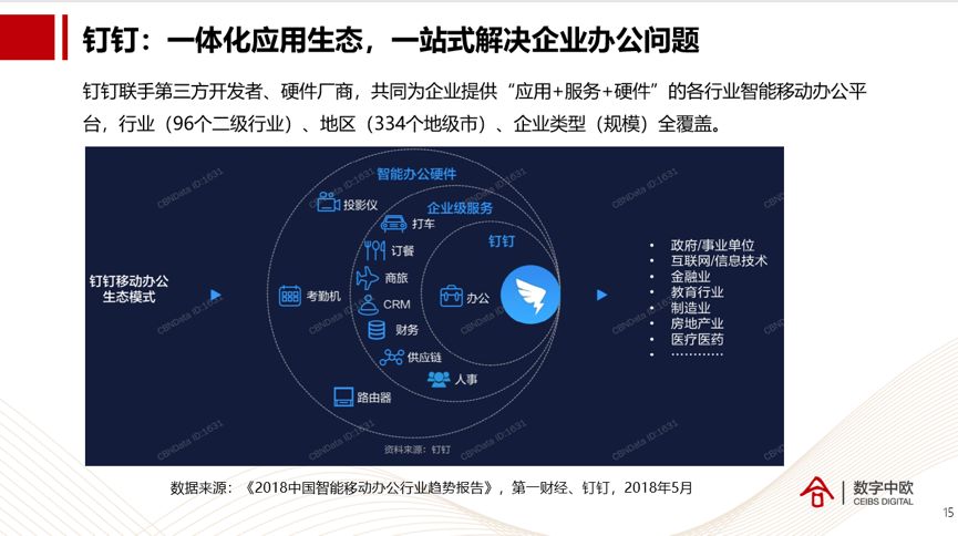 5、新的商業(yè)操作系統(tǒng) 普華永道的調(diào)研發(fā)現(xiàn),如今企業(yè)的辦公環(huán)節(jié)中,至少有一個(gè)環(huán)節(jié),能夠達(dá)到移動(dòng)化的比例在81%左右。2020年全球?qū)?huì)有100億臺(tái)的移動(dòng)設(shè)備進(jìn)入使用。這些都是協(xié)同辦公需要去注意的,不管是在安全方面,還是在這個(gè)數(shù)據(jù)的流轉(zhuǎn)方面,是不是能夠彈性兼容更多的智能設(shè)備,又能夠保證企業(yè)資產(chǎn)的安全。協(xié)同辦公作為移動(dòng)化的入口,會(huì)往生態(tài)化的方向發(fā)展。 我們以釘釘為例,阿里集團(tuán)經(jīng)常說(shuō)要做新商業(yè)操作系統(tǒng)。我們想一想,以前每個(gè)企業(yè)都必然要用到的商業(yè)操作系統(tǒng)是什么呢?PC時(shí)代,是微軟的Windows,企業(yè)幾乎每天電腦都要運(yùn)行Windows。現(xiàn)在企業(yè)幾乎每個(gè)人都會(huì)有一個(gè)手機(jī)。這個(gè)手機(jī)的操作系統(tǒng)就是iOS或者安卓。 而到了第三代的操作系統(tǒng),或者叫企業(yè)級(jí)的辦公核心是什么呢?有可能是像釘釘這一類的協(xié)同辦公軟件。企業(yè)的知識(shí)沉淀下來(lái)、企業(yè)的客戶資源、企業(yè)的員工信息、組織的管控,包括組織培訓(xùn),今天都可以沉淀到協(xié)同辦公這樣的平臺(tái)上。 協(xié)同辦公軟件一體化的應(yīng)用生態(tài)圈呢,可以概況為三個(gè)環(huán)。