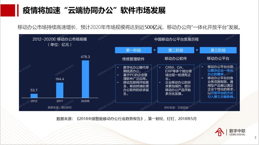 由于企業(yè)種類繁多的需求,不可能用一個(gè)軟件來(lái)實(shí)現(xiàn),因此,協(xié)同辦公就成為一個(gè)平臺(tái)。釘釘目前有超過2億的用戶,大家更多的去用一些長(zhǎng)尾的應(yīng)用,甚至開發(fā)自己的套件,這就實(shí)現(xiàn)了一個(gè)更好的互聯(lián)網(wǎng)級(jí)的生態(tài)。 所以我們可以說(shuō),很多行業(yè)在IT時(shí)代用的是ERP,這是企業(yè)級(jí)資源管理工具,那么在互聯(lián)網(wǎng)時(shí)代就是IRP,互聯(lián)網(wǎng)級(jí)的資源系統(tǒng)平臺(tái),用這個(gè)平臺(tái)去支撐企業(yè)不同時(shí)期的創(chuàng)新發(fā)展。 3、遠(yuǎn)程辦公協(xié)助企業(yè)數(shù)字化轉(zhuǎn)型 遠(yuǎn)程辦公的應(yīng)用,起到了協(xié)助企業(yè)數(shù)字化轉(zhuǎn)型的作用。 運(yùn)用遠(yuǎn)程辦公平臺(tái),使企業(yè)一步躍遷到移動(dòng)平臺(tái)上。企業(yè)的每一個(gè)工作流,可以在線上留下數(shù)據(jù)的痕跡,從而有利于企業(yè)去改進(jìn)流程和管理措施。目前企業(yè)員工的績(jī)效考評(píng),大多是在年底大家“拍腦袋”決定的。在遠(yuǎn)程辦公平臺(tái)下,有沒有可能,通過每一天的工作和數(shù)據(jù),來(lái)反映這個(gè)人的工作量、活躍程度以及橫向協(xié)同的能力。這些都可以從協(xié)同辦公軟件里取得真實(shí)的數(shù)據(jù)。 現(xiàn)在大量的企業(yè)都采用了扁平化的結(jié)構(gòu),尤其是創(chuàng)新型的科技企業(yè),很多時(shí)候我們跨部門的協(xié)同,甚至跨級(jí)別的協(xié)同,都體現(xiàn)出社交軟件的特點(diǎn)。當(dāng)我們部署遠(yuǎn)程辦公軟件之后,企業(yè)的協(xié)同,會(huì)有更好的性能。 這次不管是釘釘還是企業(yè)微信的擴(kuò)容,大量的算力、流量都花在了視頻上。到了5G時(shí)代,會(huì)有更好的帶寬,去支撐像視頻會(huì)議這樣的一些創(chuàng)新的應(yīng)用。智能化也是協(xié)同辦公軟件下一步會(huì)發(fā)展的方向,因?yàn)槊刻齑罅康墓ぷ鞫荚谠贫送瓿桑髽I(yè)會(huì)有大量的企業(yè)知識(shí)、行業(yè)知識(shí)沉淀下來(lái)。企業(yè)如果能運(yùn)用遠(yuǎn)程辦公軟件打造知識(shí)中臺(tái),從而打造一個(gè)更好的智能化的決策和決策支撐體系。 在ERP時(shí)代,企業(yè)打通了產(chǎn)業(yè)鏈的上下游,但現(xiàn)在越來(lái)越多的行業(yè)的邊界在消失,企業(yè)外部的資源開始引入企業(yè)的商業(yè)模式里。企業(yè)是否能利用遠(yuǎn)程的協(xié)同辦公和云平臺(tái),實(shí)現(xiàn)一個(gè)生態(tài)的互聯(lián),這也是企業(yè)需要考慮的。 4、作為災(zāi)備系統(tǒng)的遠(yuǎn)程辦公 企業(yè)最關(guān)鍵的核心競(jìng)爭(zhēng)力,是由它的組織結(jié)構(gòu)來(lái)決定的。 如今,組織治理也在數(shù)字化。企業(yè)通過前臺(tái)大量的創(chuàng)新型的辦公,以“小前端+中臺(tái)”的形式,將共享的數(shù)據(jù)、業(yè)務(wù)沉淀在中臺(tái)上的共享服務(wù)中心。企業(yè)的前端可以做的很輕,甚至可以用小程序運(yùn)營(yíng),這樣企業(yè)可以對(duì)接大量的行業(yè)合作伙伴,包括他們的系統(tǒng)和業(yè)務(wù),這樣就能組成一個(gè)快速奔跑的創(chuàng)新模式,實(shí)現(xiàn)從組織到技術(shù),再到業(yè)務(wù)創(chuàng)新的更好的引領(lǐng)。 這次全民上網(wǎng)遠(yuǎn)程辦公的體驗(yàn)之后,會(huì)不會(huì)有大量的企業(yè)開始用遠(yuǎn)程辦公軟件,在非疫情時(shí)期,形成一個(gè)業(yè)務(wù)的災(zāi)難備份?我們也是企業(yè)應(yīng)對(duì)危機(jī)的方式。現(xiàn)在有些行業(yè)已經(jīng)在嘗試,比如說(shuō)政府、醫(yī)療領(lǐng)域都有相關(guān)的遠(yuǎn)程運(yùn)用。我們預(yù)測(cè),這種災(zāi)備的協(xié)同模式,在疫情之后,會(huì)有一個(gè)大的發(fā)展。