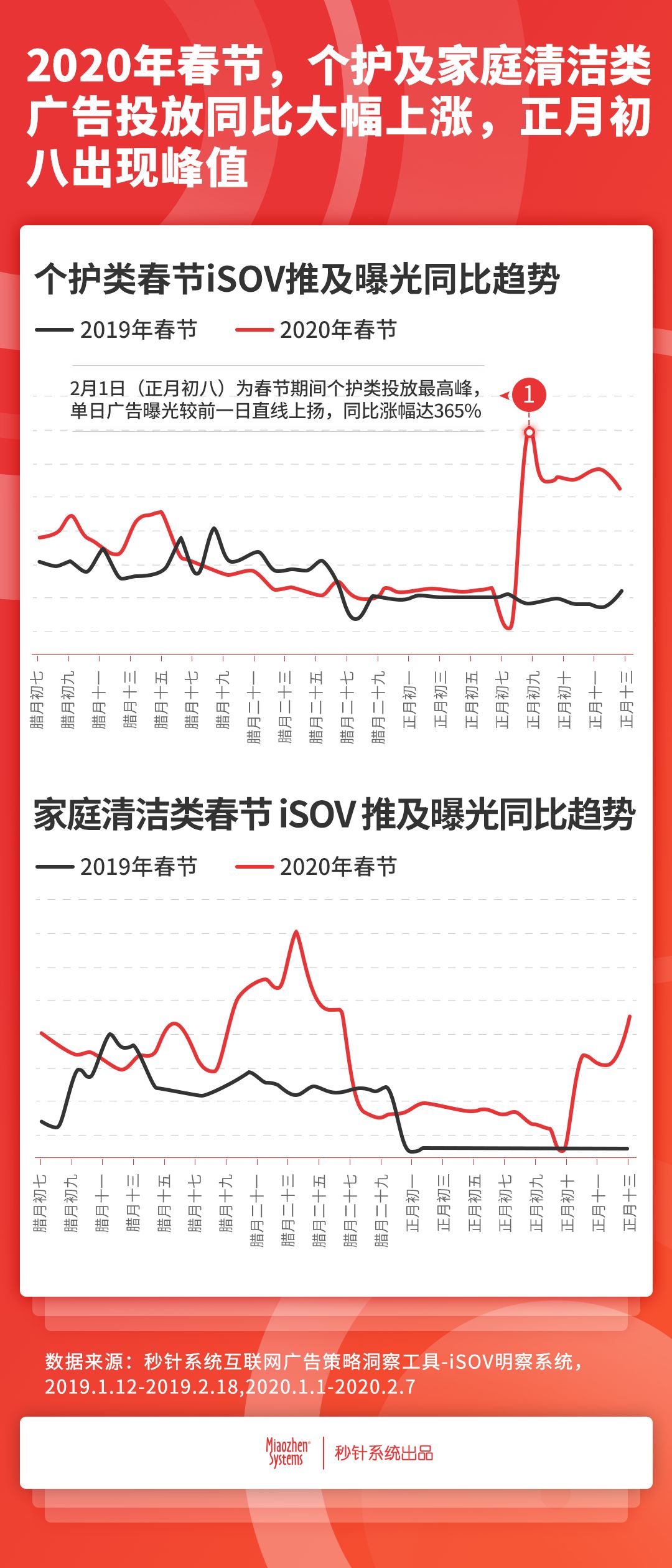 1月20日專家肯定新型冠狀病毒存在人傳人后,飛沫傳播、接觸傳播及糞口傳播等傳染途徑相繼被確認(rèn),“戴口罩,不出門,多通風(fēng)”之余,“勤洗手”也成為人們?nèi)粘?ldquo;戰(zhàn)疫”必備。個(gè)護(hù)及家庭清潔產(chǎn)品作為自我防護(hù)的重要屏障,需求迎來(lái)爆發(fā)性增長(zhǎng),但同時(shí),不少產(chǎn)品的功效及成分也開(kāi)始吸引消費(fèi)者的關(guān)注,質(zhì)疑聲也隨之而來(lái)。 人傳人及接觸傳播證實(shí),個(gè)護(hù)廣告投放同比最高漲幅達(dá)365%,視頻服務(wù)、應(yīng)用工具、綜合資訊為TOP3渠道。 春節(jié),作為一年一度闔家團(tuán)聚的時(shí)節(jié),是家庭消費(fèi)的高峰期,歲末的例行大掃除會(huì)使家庭清潔消費(fèi)上漲,相關(guān)的廣告投放也順勢(shì)增加,春節(jié)后需求、投放則相應(yīng)回落,2019年春節(jié)期間個(gè)護(hù)及家庭清潔廣告推及曝光就符合這樣的趨勢(shì)。 但2020年,由于疫情與春節(jié)同期,需求的爆發(fā)使得這一曲線發(fā)生明顯變化,明察數(shù)據(jù)顯示,2020年春節(jié)后,個(gè)護(hù)及家庭清潔類廣告iSOV推及曝光同比大幅增長(zhǎng)。其中,2月1日(正月初八)為個(gè)護(hù)類投放最高峰,單日廣告曝光較前一日直線上揚(yáng),同比2019年漲幅達(dá)365%,此后,廣告曝光量雖有些許回落,但同比仍處在較高水平。家庭清潔類投放的爆發(fā)雖來(lái)的晚了些,但推及曝光曲線也出現(xiàn)類似變化,較去年同期接近于0的投放,2月4日(正月十一)投放量陡增。