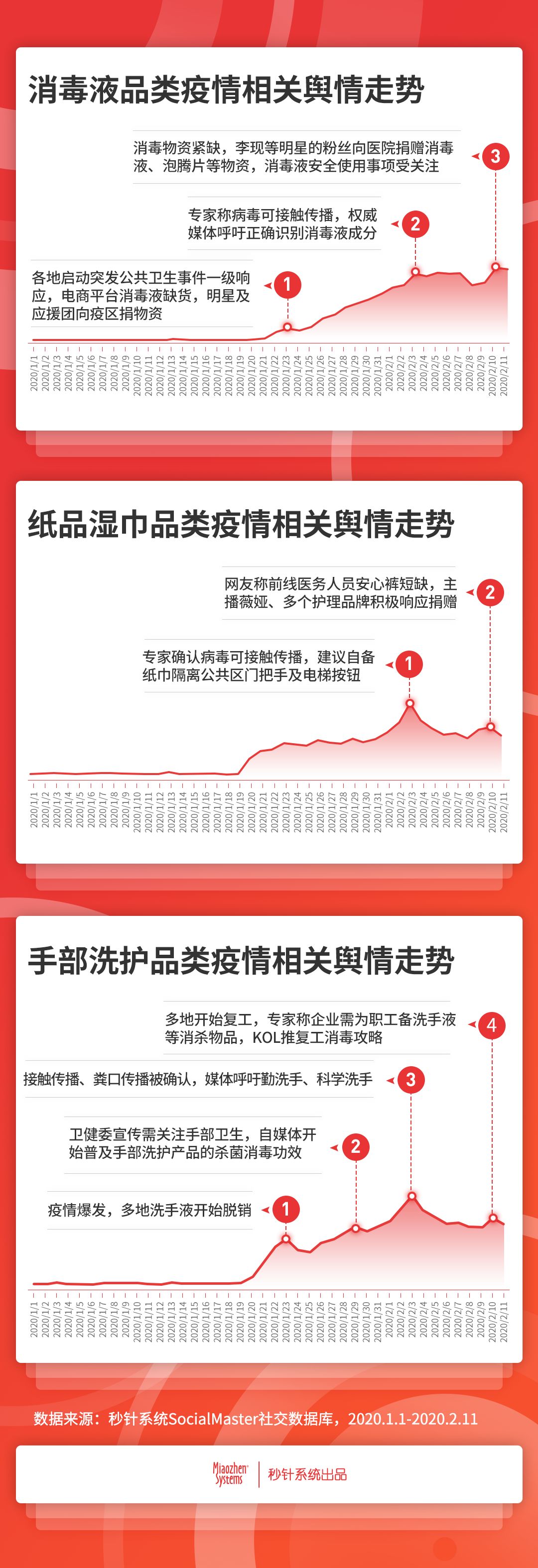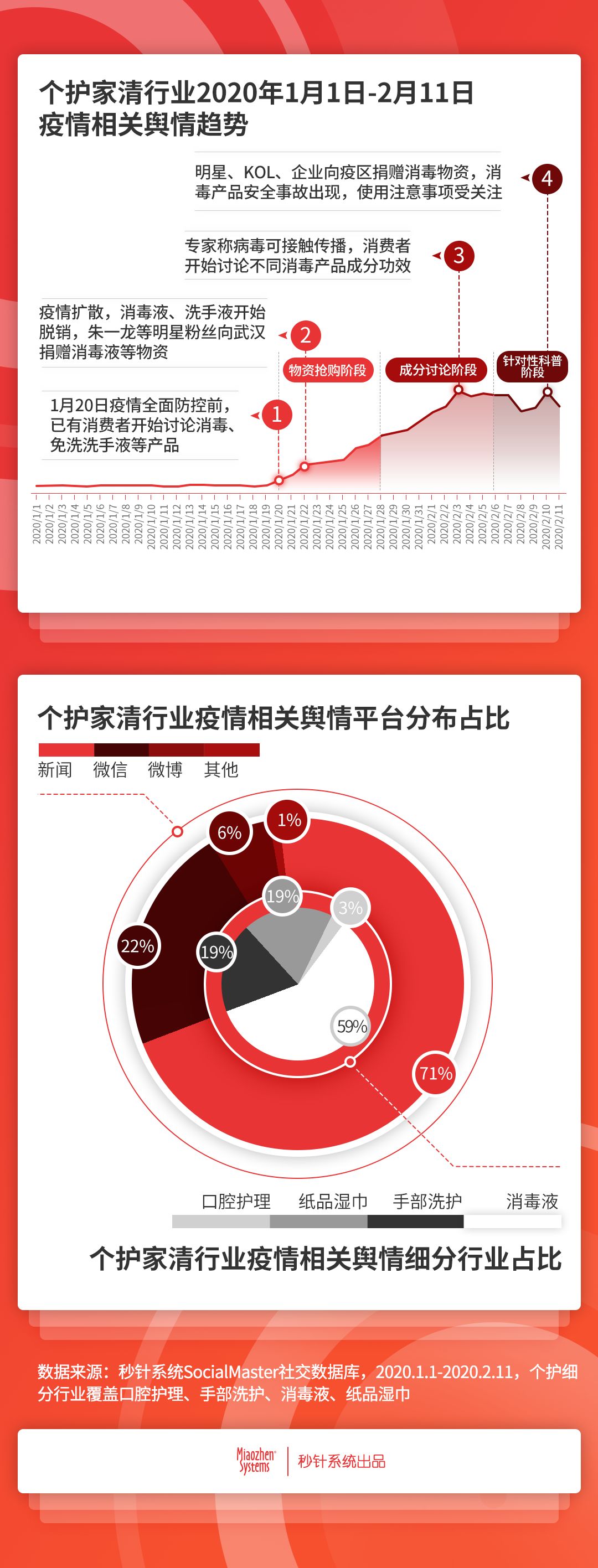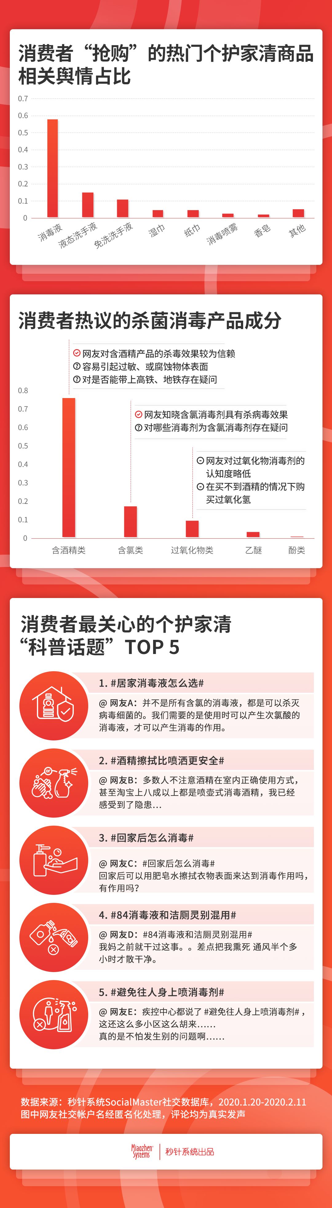 搶購(gòu)到成分質(zhì)疑再到科普,消費(fèi)者相關(guān)輿情分三階段爬升 消費(fèi)者輿情方面,雖然“戰(zhàn)疫”行動(dòng)正式打響是在1月20日之后,但秒針系統(tǒng)SocialMaster社交數(shù)據(jù)顯示,在此之前,消費(fèi)者就已經(jīng)開(kāi)始討論消毒劑、免洗洗手液等防護(hù)產(chǎn)品。1月20日后,個(gè)護(hù)家清行業(yè)疫情相關(guān)討論開(kāi)始不斷攀升,截止2月11日,輿情總量的最大峰值已是1月初最低值的60倍。 相關(guān)討論中,消毒液最受關(guān)注,占比近6成,手部洗護(hù)及紙品濕巾關(guān)注度比肩,分別占比19%。從消費(fèi)者輿情的媒體平臺(tái)分布來(lái)看,新聞資訊類媒體最為活躍,占比超7成,其次是微信,占比22%。 具體來(lái)說(shuō),除了1月19日消費(fèi)者開(kāi)始討論消毒殺菌,全平臺(tái)輿情相繼又經(jīng)歷了3個(gè)關(guān)鍵發(fā)酵點(diǎn),及3個(gè)討論階段: 物資搶購(gòu)階段:時(shí)間為1月20日至27日。隨著疫情爆發(fā),消費(fèi)者開(kāi)始大量搶購(gòu)個(gè)護(hù)及家庭清潔用品,多地出現(xiàn)相關(guān)產(chǎn)品脫銷情況。與此同時(shí),公共交通開(kāi)始定期消毒,多位明星的粉絲向疫區(qū)捐贈(zèng)消毒、洗手液等物資; 成分討論階段:時(shí)間為1月28日至2月5日。搶購(gòu)清潔用品的同時(shí),大量有效防護(hù)科普貼出現(xiàn),輿論轉(zhuǎn)向討論消毒液、洗手液成分,關(guān)注相關(guān)產(chǎn)品是否能有效殺毒,個(gè)別品牌的效能被質(zhì)疑; 針對(duì)性科普階段:時(shí)間為2月5日至11日。隨著各地相繼復(fù)工,消毒液安全事件出現(xiàn),針對(duì)性的科普貼大量涌現(xiàn)。與此同時(shí),明星粉絲、KOL及個(gè)護(hù)品牌紛紛向疫區(qū)捐贈(zèng)物資。作為獨(dú)立的輿情版塊,科普類話題的廣受關(guān)注,體現(xiàn)出學(xué)習(xí)型消費(fèi)者在“搶購(gòu)”之余,理性思考能力的提升,包括對(duì)成分本身的分析,不同成分應(yīng)用方式和場(chǎng)景的說(shuō)明和討論等等。