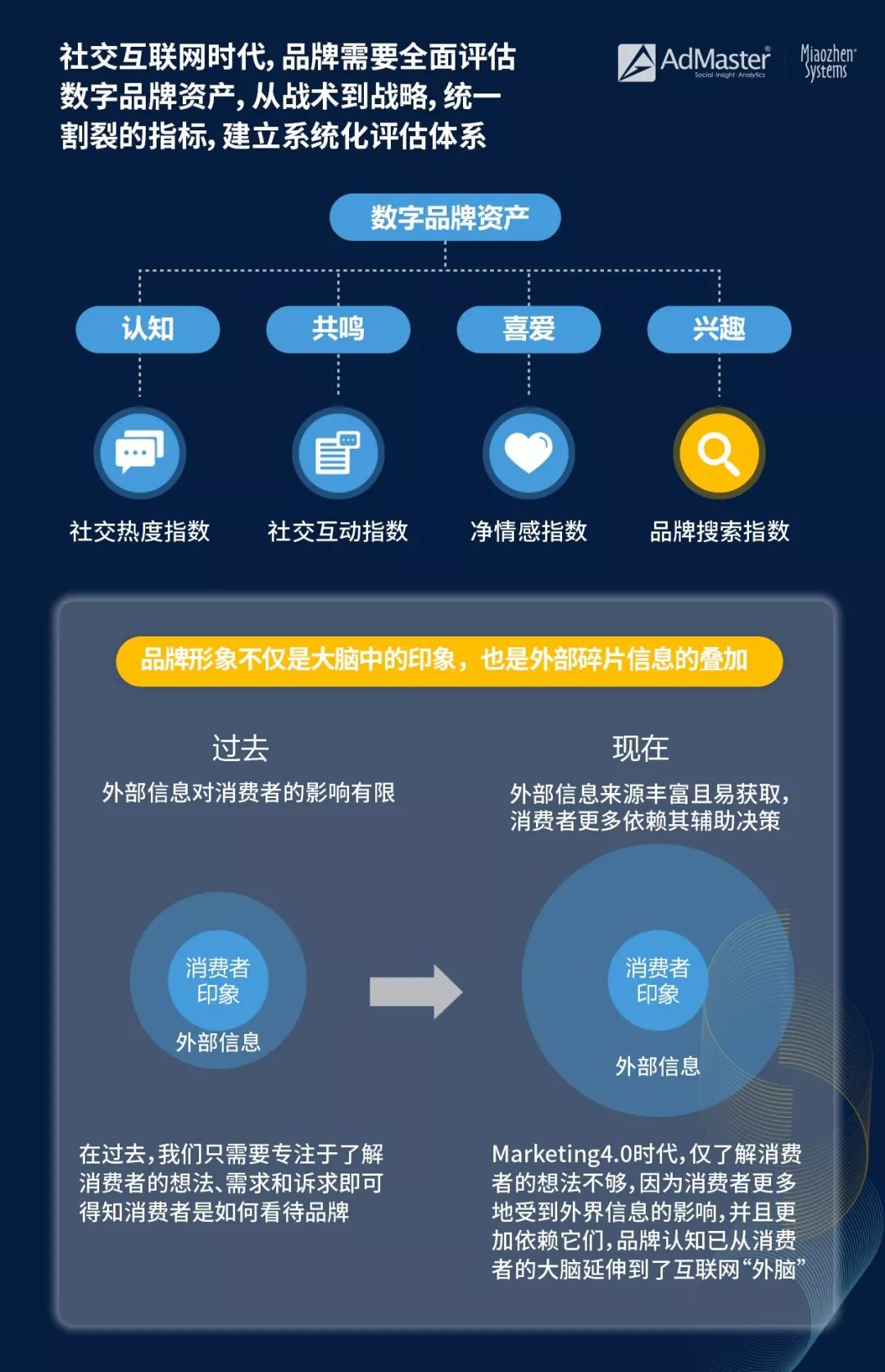 告別“野蠻生長” 系統化社交衡量體系呼之欲出 隨著社交融入生活日常,消費者對品牌的認知,已不限于自己的印象,而是更多訴諸于外部紛繁的信息,品牌形象更多是外部碎片信息的疊加,受此影響,消費者的消費路徑也已革新,網絡口碑和他人意見一定程度上直接影響其購買決策。 中國社交雖已走過崢嶸20載,但社交營銷的衡量,卻依舊缺乏統一的體系,天下苦聲量久矣,然而從聲量到聲量+互動+正負面,衡量的指標雖不斷增加,但多個指標間卻相互割裂,不同平臺的重要性無法體現,且無法實現跨平臺比較。隨著品牌不斷加碼社交營銷,以往僅從戰術層面看一波活動效果的衡量方法,已不能滿足其戰略需求,品牌亟需一個能從戰略高度,看到不同平臺中自己在消費者以及行業中所處位置的品牌數字資產指標,并對其進行持續監測。