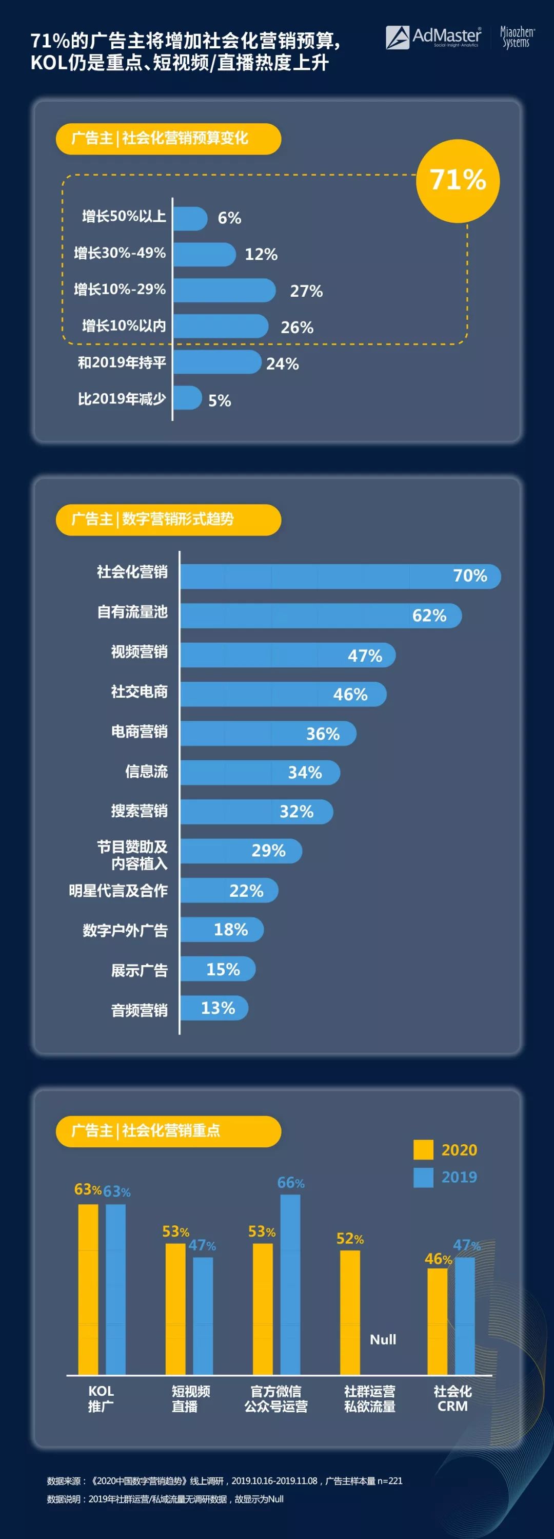 7成品牌加碼社交營銷 KOL仍是重點,短視頻/直播熱度上升 AdMaster聯合秒針系統、GDMS發布的《2020中國數字營銷趨勢》數據顯示,即將到來的2020年,社會化營銷是最受廣告主關注的數字營銷形式,71%的廣告主表示將增加社會化營銷投入,預算平均增長15%。其中,KOL推廣,依然最受重視,勢頭兇猛的短視頻,2019年異軍突起的直播帶貨,熱度大幅上升,比肩官方微信運營。
