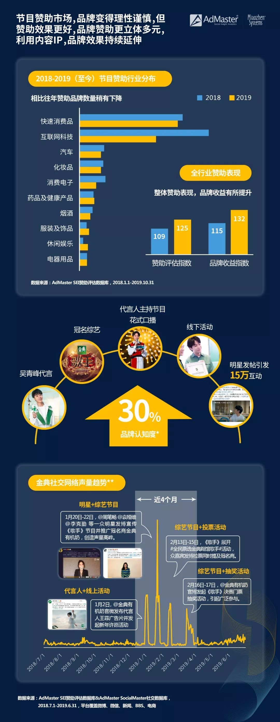 搭建多維贊助矩陣 內容營銷精耕細作提升收益 在影視行業經受寒冬的同時,內容贊助市場2019年也趨向緊縮,很多綜藝因缺乏品牌贊助而被迫取消,背后原因,一是綜藝劇目整體創新乏力,另一個重要原因則是品牌方贊助日趨理性。AdMaster SEI贊助評估數據顯示,相較2018年,2019年贊助品牌的數量明顯下降,互聯網科技、消費電子等熱門贊助行業贊助數量下滑,其中,尤以互聯網科技行業為甚,降幅達40%,不過,贊助商數量減少的同時,品牌贊助評估指數和品牌收益卻同比提升,這表明品牌內容贊助已告別砸錢模式,轉向精耕細作。 砸重金冠名一檔綜藝,品牌該如何充分發揮其價值? 答案是利用內容IP搭建多維贊助矩陣。以伊利金典為例,圍繞代言人,在微博中頻繁與他互動撩粉,線下活動也同步邀請其出席,這一套組合拳使其品牌認知度上升30%。通過明星代言+節目贊助+社交互動+線下活動的多維營銷體系,金典成功將節目內熱度拓展至節目外,在社交平臺中保持高聲量長達近4個月之久。