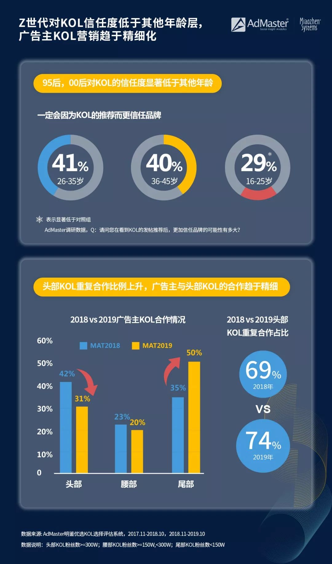 轉化轉化轉化 直播、短視頻即時帶貨風頭愈加強勁 2019年雙11,戲份最重的,莫過于淘寶直播,電商直播帶貨,已成為品牌營銷的新模式。頭部主播一天的帶貨能力堪比超級商場一年之外,品牌自播賣貨效益也不容小覷,淘寶直播粉絲量TOP10均為品牌賬號。歐萊雅雙11預售首日直播17小時近百萬人觀看,轉化率遠高于線下專柜。雖然KOL直播翻車不時上演,但作為常規電商營銷之外的帶貨利器,直播的價值遠遠高于其風險,仍有廣闊開發空間。 淘寶直播之外,短視頻也在探索帶貨路徑并卓有成效,快手憑借原產地低價直銷策略,成功推動電商業務發展。據AdMaster社交數據庫數據,2019年Q3,社交平臺中同時提及“快手”以及“想買”“種草”“買了”等購買傾向詞的聲量較Q2增長126%。不少平臺紛紛加碼直播,小紅書近期也內測直播功能,繼承其在互動和種草上的優勢,引流到自有電商平臺。 KOL營銷去水先行 中長尾KOL及社群培育走紅 據Fullscreen Media及AdMaster調研數據,在全球KOL風靡的背景下,中國消費者對KOL傳播的信任度、推薦度和購買力均高于全球水平,尤其是購買意愿。但高度商業化的中國KOL市場,虛假廣告和數據造假橫行,導致年輕消費群對KOL的信任度降低,AdMaster調研數據顯示,相比于26-45歲消費者40%左右的信任度,95/00后中一定會因為KOL推薦而更信任品牌的比例,僅為29%。水軍橫行的背景下,品牌選擇KOL前,一定要仔細甄別,去偽存真。 去水之外,KOL營銷的另一大趨勢,就是強化對中長尾KOL價值的挖掘。AdMaster明鑒優選KOL系統數據顯示,相比2018年,2019年廣告主跟主流社交媒體KOL合作的占比中,頭部KOL同比降低11%,尾部KOL占比上升15%,至50%。不過,頭部KOL合作占比雖有所下降,但重復合作占比卻同比上升,廣告主與頭部KOL的合作更深入。此外,為了與KOL建立長期可持續的合作關系,提升KOL對品牌的喜愛度,已經有部分品牌開始培育自有KOL社群。