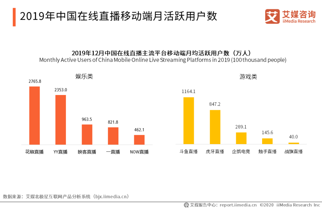2019年中國在線直播移動端月活躍用戶數 iiMedia Research(艾媒咨詢)數據顯示,2019年12月,花椒直播以2765.8萬月均活躍用戶數排在娛樂類直播平臺首位,保持了增長態勢。游戲類直播平臺中,斗魚直播、虎牙直播月均活躍用戶數領先。可見頭部直播平臺在用戶體量方面優勢明顯。