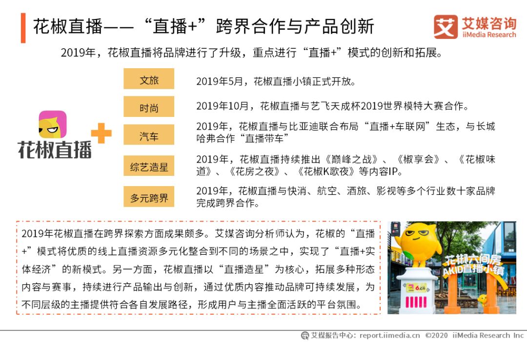 花椒、斗魚的“直播+綜藝”節目知名度高 iiMedia Research(艾媒咨詢)數據顯示, 2019年花椒直播、斗魚直播在“直播+綜藝”領域中表現亮眼,平臺的“直播+綜藝”節目知名度較高。艾媒咨詢分析師認為,大部分直播用戶出于娛樂需求觀看直播節目, 而“直播+綜藝”節目娛樂性強,直播平臺可以此豐富平臺自身內容生態,持續優質內容輸出,在“直播+”模式中取得競爭優勢。
