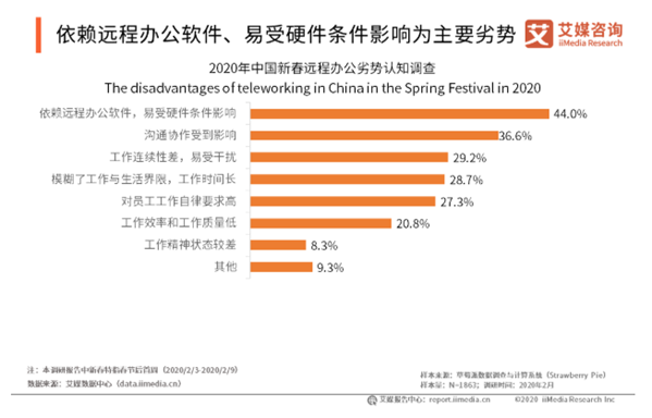 確實,借助互聯(lián)網(wǎng)進行線上辦公,受工作地點影響小,辦公安排較為靈活;而在家辦公還節(jié)省了通勤時間與交通費用,方便快捷。 然而有意思的是,在各類社交媒體中,關(guān)于遠程辦公的討論,更多是吐槽的聲音。在家容易被打擾、網(wǎng)速不穩(wěn)定、溝通不順暢等問題,匯聚成了一句:好想上班,回公司的那種! 調(diào)查結(jié)果也顯示,超四成的受訪用戶表示,遠程辦公存在依賴軟件,易受硬件條件影響的問題;近四成受訪用戶認(rèn)為,遠程辦公溝通協(xié)作受到影響。不過,在多日的磨合下,已有超過五成的受訪用戶表示適應(yīng)遠程辦公模式。