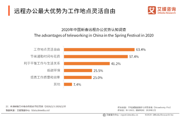 被疫情和社會需求推到了舞臺中央的遠程辦公,一下子被摁下了加速鍵。 數(shù)據(jù)顯示,中國智能移動辦公市場規(guī)模逐年上升,2019年中國智能移動辦公市場規(guī)模達288億元,預(yù)計2020年市場規(guī)模將達到375億元,增長率為30.%。遠程辦公需求的激增也進一步催化了智能移動辦公發(fā)展。 超過五成的受訪用戶適應(yīng)遠程辦公模式 另外,在用戶方面。相信很多朋友也曾設(shè)想過在家里辦公,輕輕松松,無拘無束。從調(diào)查來看,超過六成的受訪用戶認(rèn)為遠程辦公的優(yōu)勢,在于工作地點靈活自由;超過五成的受訪用戶認(rèn)為遠程辦公節(jié)省了通勤時間與花費。