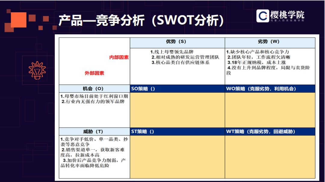 滲透力包括紙尿褲、嬰幼兒牛奶粉、睡袋、洗護(hù)用品等; 復(fù)購(gòu)力包括嬰幼兒牛奶粉、嬰童褲子、套裝、運(yùn)動(dòng)鞋等; 價(jià)格力包括紙尿褲、濕巾、手推車等,很多品牌是依靠產(chǎn)品顏值提升價(jià)格力的。紙尿褲是一個(gè)廝殺比較厲害的品類,但是在2019年依然有品牌脫穎而出,例如babycare,它整體的顏值是比較高的,從而拉升了價(jià)格力,可以對(duì)比一下它的價(jià)格和店鋪,憑借顏值增加了產(chǎn)品的溢價(jià)能力; 延展力包括嬰童板鞋、孕婦褲中的直筒褲、孕產(chǎn)修復(fù)儀中的產(chǎn)后塑形等儀器,以及孕婦裝里的孕產(chǎn)婦鈴鐺。另外舉一下之前在可優(yōu)比做過的一個(gè)品類作為例證,就是防摔枕。防止寶寶學(xué)步時(shí)仰摔到頭部,這一產(chǎn)品解決了用戶的痛點(diǎn),用戶自然會(huì)買單,這也是延展出來的一個(gè)產(chǎn)品。 1、根據(jù)GROW模型,打法沉淀 一是通過CRM,增加與該類人群的互動(dòng),持續(xù)召回老客,加強(qiáng)復(fù)購(gòu),老帶新裂變。購(gòu)買頻次為核心驅(qū)動(dòng)因子;利用其高頻購(gòu)買忠誠(chéng)度一特性,增強(qiáng)該策略人群與品牌的粘性。 二是廣泛吸引AI人群,站外種草,活動(dòng)前預(yù)熱,促進(jìn)該類人群對(duì)品牌首單購(gòu)買。購(gòu)買人數(shù)為核心驅(qū)動(dòng)因子;利用其人群增量,提高品類在該人群中的滲透能力。 三是品類核心人群,通過單品類輻射到品牌其他品類,先做單品類的爆破和擊穿,然后再延伸到其他品類,提高客單的連帶率。 四是新品發(fā)售&單品組套發(fā)售目標(biāo)人群,促進(jìn)高客單轉(zhuǎn)化。核心驅(qū)動(dòng)因子為頻次和客單價(jià);利用新品吸引購(gòu)買或者利用套裝增加策略人群的高客單購(gòu)買。 2、GROW產(chǎn)品模型 如何落地 首先是戰(zhàn)略規(guī)劃能力。我們發(fā)現(xiàn),遇到戰(zhàn)略轉(zhuǎn)型,很多時(shí)候企業(yè)會(huì)選擇全做或全不做,很少進(jìn)行針對(duì)性的側(cè)重和選擇。前者會(huì)導(dǎo)致企業(yè)的戰(zhàn)略資源被攤薄,執(zhí)行達(dá)不到效果;后者則會(huì)讓企業(yè)陷入溫水煮青蛙的境地。戰(zhàn)略其實(shí)就是做權(quán)衡,而 GROW 模型的目的正是協(xié)助企業(yè)更明智地做選擇。 其次是提升組織能力,包括商品開發(fā)、數(shù)字化營(yíng)銷、大數(shù)據(jù)分析等 ,特別需要建立統(tǒng)一的數(shù)據(jù)中臺(tái),整合各領(lǐng)域數(shù)據(jù),包括消費(fèi)者分群信息、消費(fèi)者線上及線下的購(gòu)物車信息、消費(fèi)者瀏覽行為信息、按品類的銷售信息、按促銷的銷售及利潤(rùn)信息等。這樣才能為后端的品類開發(fā)和前端營(yíng)銷部門提供明確的方向指導(dǎo)。 最后要改變傳統(tǒng)的工作方式,推行敏捷工作方法和鼓勵(lì)試錯(cuò)的創(chuàng)新文化。敏捷不僅僅指速度效率的提升,更是真正以客戶為中心,快速滿足客戶的需求和反饋;打破部門墻,加強(qiáng)團(tuán)隊(duì)協(xié)作;提升員工權(quán)限和主人翁意識(shí)。與數(shù)字原生企業(yè)相比,傳統(tǒng)消費(fèi)品企業(yè)的文化厭惡風(fēng)險(xiǎn),崇尚效率。然而互聯(lián)網(wǎng)平臺(tái)讓企業(yè)創(chuàng)新的成本大大降低,企業(yè)不妨將線上作為“嘗新”的測(cè)試平臺(tái),鼓勵(lì)快速創(chuàng)新、快速失敗,并根據(jù)關(guān)鍵數(shù)據(jù)指標(biāo)進(jìn)行快速迭代試錯(cuò),最終打造出爆款產(chǎn)品。 更加嚴(yán)謹(jǐn)?shù)淖霎a(chǎn)品—競(jìng)爭(zhēng)分析,就是SWOT分析,找到我們的優(yōu)勢(shì)和劣勢(shì),我們的機(jī)會(huì)和威脅都有哪些,內(nèi)部和外部因素都有哪些。
