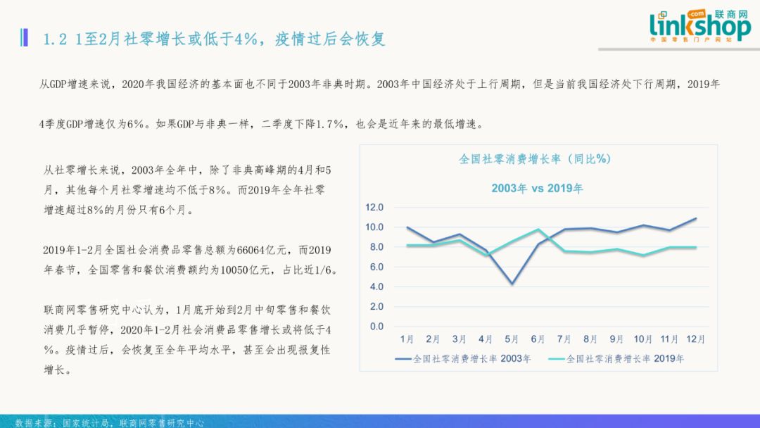 二)1至2月社零增長或低于4% 疫情后會恢復 從GDP增速來看,2020年我國經濟基本面不同于2003年非典時期。2003年中國經濟處于上行周期,但是當前我國經濟處下行周期,2019年四季度GDP增速僅為6%。如果GDP與非典一樣,二季度下降1.7%,也會是近年來的最低增速。 從社零增長來看,2003年全年,除了非典高峰期的4月和5月,其他各月份社零增速均不低于8%。而2019年全年社零增速超過8%的月份只有6個月。 2019年1-2月全國社會消費品零售總額為66064億元,而2019年春節,全國零售和餐飲消費額約為10050億元,占比近1/6。 聯商網零售研究中心認為,1月底開始到2月中旬零售和餐飲消費幾乎暫停,2020年1-2月社會消費品零售增長或將低于4%。疫情過后,會恢復至全年平均水平,甚至會出現報復性消費增長。