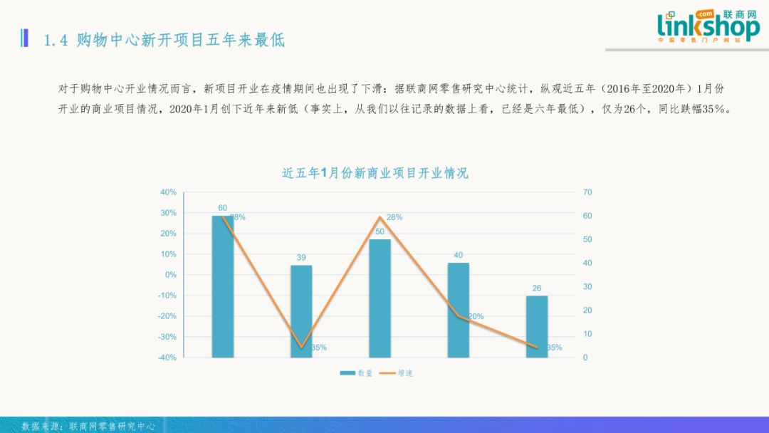 四)購物中心新開項目五年來最低 對于購物中心開業情況而言,新項目開業在疫情期間也出現了下滑。縱觀近五年(2016年至2020年)1月份開業的商業項目情況,2020年1月創下了近年來新低(事實上,從我們以往記錄的數據上看,已經是六年最低),僅為26個,同比跌幅達35%。