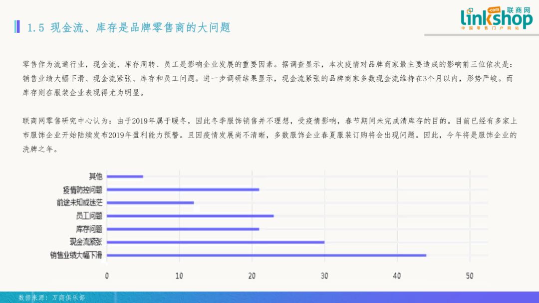 五)現金流、庫存是品牌零售商的大問題 零售作為流通行業,現金流、庫存周轉、員工是影響企業發展的重要因素。據調查顯示,本次疫情對品牌商家最主要造成的影響前三位的依次是:銷售業績大幅下滑、現金流緊張、庫存和員工問題。進一步調研結果顯示,現金流緊張的品牌商家多數現金流維持在3個月以內,形勢嚴峻。而庫存則在服裝企業表現得尤為明顯。 聯商網零售研究中心認為,由于2019年屬于暖冬,因此冬季服飾銷售并不理想,受疫情影響,春節期間未完成清庫存的目標。目前已經有多家上市服飾企業開始陸續發布2019年盈利能力預警。且因疫情發展尚不清晰,多數服飾企業春夏服裝訂購將會出現問題。因此,今年將是服飾企業的洗牌之年。