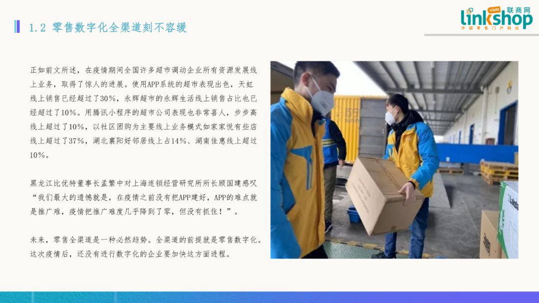 二)零售數字化全渠道刻不容緩 正如前文所述,在疫情期間全國許多超市調動企業所有資源發展線上業務,取得了驚人的進展。使用APP系統的超市表現出色,天虹線上銷售已經超過30%,永輝生活線上銷售占比也已經超過10%。用騰訊小程序的超市公司表現也非常喜人,步步高線上超過10%,以社區團購為主要線上業務模式如家家悅有些門店線上超過37%,湖北襄陽好鄰居線上占14%、湖南佳惠線上超過10%。 未來,零售全渠道是一種必然趨勢。全渠道的前提就是零售數字化。這次疫情后,還沒有進行數字化的企業要加快這方面進程。