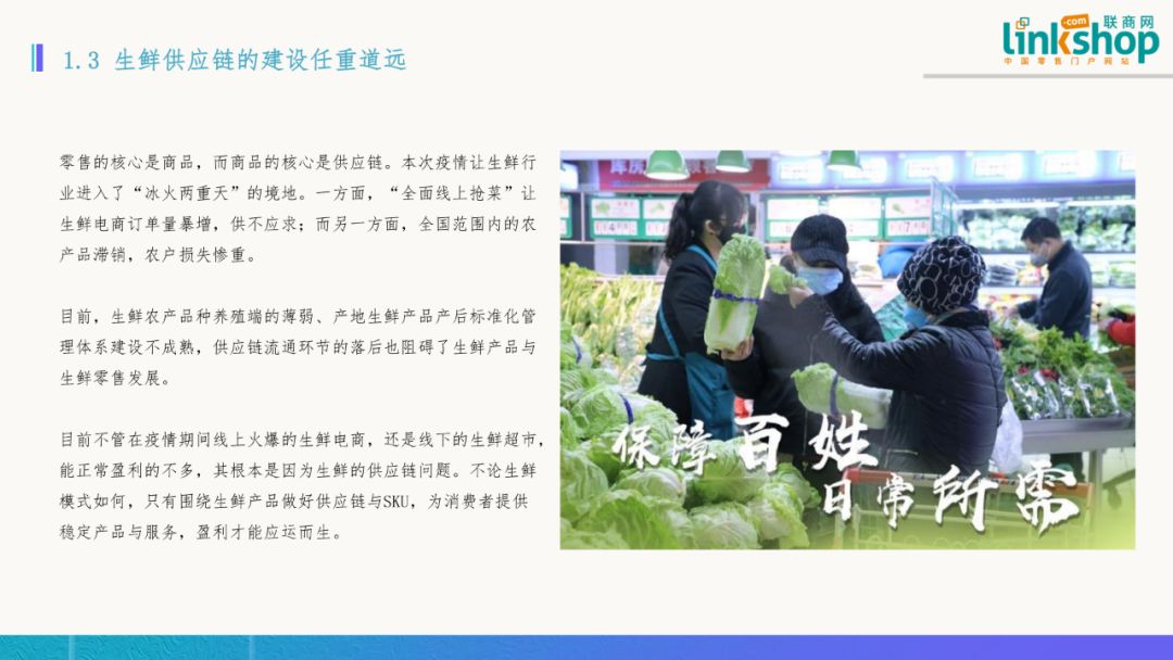 三)生鮮供應鏈的建設任重道遠 零售的核心是商品,而商品的核心是供應鏈。本次疫情讓生鮮行業進入了“冰火兩重天”的境地。一方面,“全面線上搶菜”讓生鮮電商訂單量暴增,供不應求;而另一方面,全國范圍內的農產品滯銷,農戶損失慘重。 目前,生鮮農產品種養殖端的薄弱、產地生鮮產品產后標準化管理體系建設不成熟,供應鏈流通環節的落后也阻礙了生鮮產品與生鮮零售發展。 目前不管在疫情期間線上火爆的生鮮電商,還是線下的生鮮超市,能正常盈利的不多,其根本是因為生鮮的供應鏈問題。不管生鮮模式如何,只有圍繞生鮮產品做好供應鏈與SKU,為消費者提供穩定產品與服務,盈利才能應運而生。