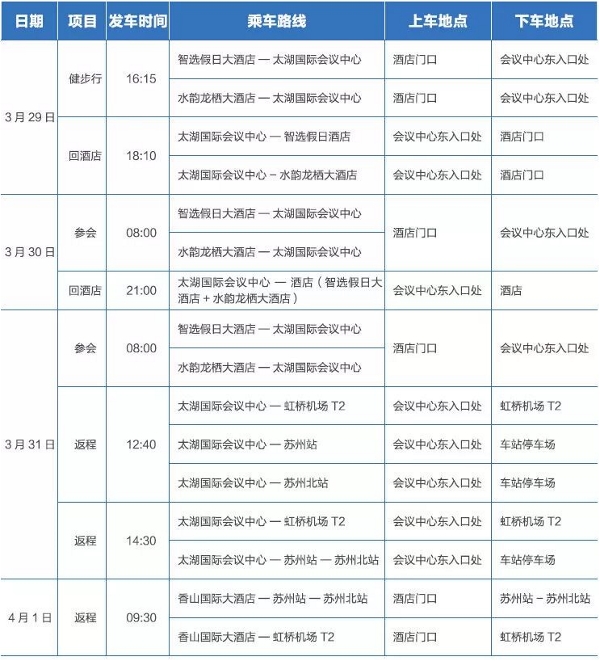 大會時間 2018年3月30-31日 參會地點 蘇州太湖國際會議中心 地址:蘇州市太湖國家旅游度假區環太湖大道128號 會議期間,蘇州氣溫在12°~24°度之間,以多云為主,請合理安排衣著,建議攜帶雨具。 入住酒店 酒店:蘇州太湖香山國際大酒店 地址:吳中區環太湖大道煙波路 1號 報道接待:劉曉姝(領取參會代表證和參會指南) 電話:13717550056 酒店:蘇州水韻龍棲大酒店 地址:吳中區胥口鎮孫武路1015號 報道接待:陳靜(領取參會代表證和參會指南) 電話:13581782413 酒店:蘇州太湖智選假日酒店 地址:吳中區孫武路2017號 報道接待:郭孟優(領取參會代表證和參會指南) 電話:15011478466 參會專車 上海專車 上海虹橋機場T2 接站時間:3月29日12:00-19:00 接站地點:虹橋機場T2大巴車停車場 聯系人:殷志杰 電話:13810869978 蘇州專車 蘇州火車站 接站時間:3月29日12:00-20:00 接站地點:蘇州站停車場(姑蘇區蘇錦合街公交站東北50米) 聯系人:盛月 電話:18510068141 蘇州北站 接站時間:3月29日12:00-20:00 接站地點:蘇州北站停車場(蘇州北站北廣場) 聯系人:張運洋 電話:13718870380 會議用餐 3月30日-31日,統一安排會議期間的正餐,餐券擺放在會場座位上,參會代表憑餐券就餐。 用餐時間、地點: 3月30日12:00-13:00 3月30日17:15-18:30 3月31日12:00-13:00 地點:太湖國際會議中心一層和合廳 會議議程