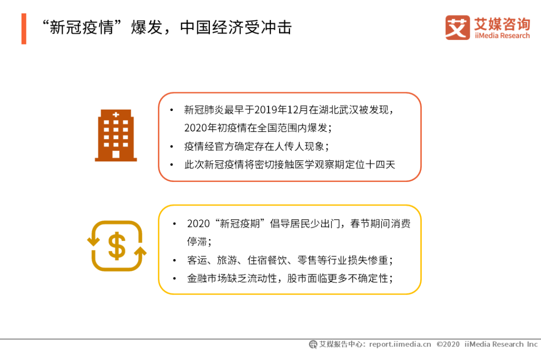 導讀 2020“新冠疫情”爆發,中國金融行業調整業務運營并積極踐行公益,樹立了良好形象獲得超六成網友認可。疫情為中國金融深化線上轉型提供契機,金融業務線上化、科技化和數據化轉型有望提速。“新冠疫情”過后市場經濟將迎來反彈,金融行業或面臨較大機遇。 報告核心觀點 “新冠疫情”爆發,滬深股市開市首日超3600只個股下跌,央行干預后股市表現趨于穩定。2020年春節期間中國遭遇“新冠疫情”爆發,零售業、旅游業、餐飲業等均受打擊,市場蒸發過萬億元。消費抑制下,金融業同樣受到沖擊,2月3日復市首日超3600只股票下跌。2月3日央行通過公開市場操作向市場投放大量流動性,兩日累計投放1.7萬億以提振市場,隨后股市表現趨于穩定。 金融企業積極應對挑戰,疫情過后或面臨反彈機遇。面對“新冠疫情”對行業的沖擊,金融企業積極應對,調整業務以及借助利好政策減少損失。iiMedia Research(艾媒咨詢)數據顯示,2003年非典過后中國經濟迎來反彈,“新冠疫情”過后,市場或再次面臨快速上升機遇。 金融企業積極踐行社會公益,樹立良好形象獲六成網民認可。2020年“新冠疫期”中國金融企業展開多種形式公益援助行動,抗擊疫情,并樹立良好企業形象。iiMedia Research(艾媒咨詢)數據顯示,61.8%的受訪網民對金融行業公益行為表示欣賞支持。在疫情期間樹立良好形象的金融企業,面對疫情過后社會或將迎來的發展機遇時,將更具競爭力,更受用戶信任。 以下為報告節選內容 “新冠疫情”爆發,中國經濟受沖擊 2020年由新型冠狀病毒引發的疫情在全國范圍內爆發,打破了社會經濟發展往常的秩序。2020“新冠疫期”居民消費大幅度減少,客運、旅游、餐飲住宿等行業基本顆粒無收,金融市場面臨更多不確定性。