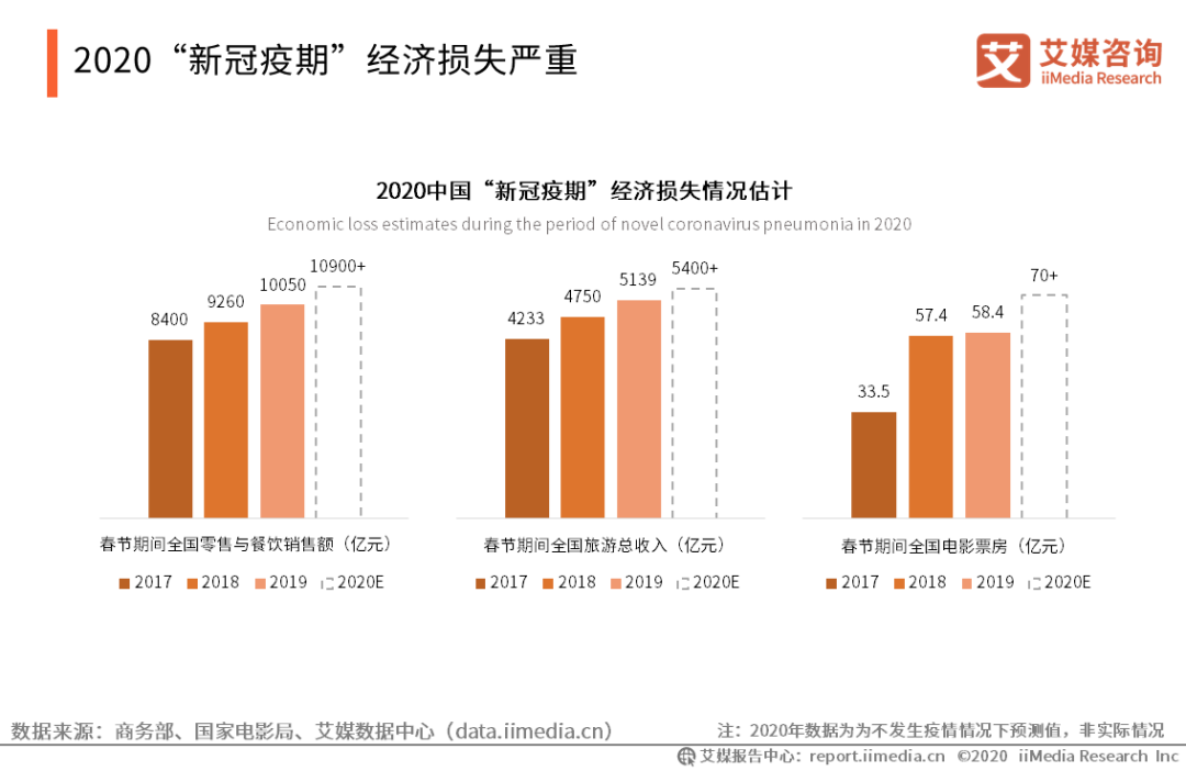 2020“新冠疫期”經濟損失嚴重 iiMedia Research(艾媒咨詢)數據顯示,2020年春節期間,中國零售與餐飲預計損失超10000億元,旅游收入損失超5000億元,電影票房損失超70億元。艾媒咨詢分析師認為,春節假期(除夕至初六)是中國國民消費黃金時期,新型冠狀病毒疫情爆發期間恰逢2020年春節,對中國經濟造成巨大影響。各行業受疫情影響基本停滯,損失較大。