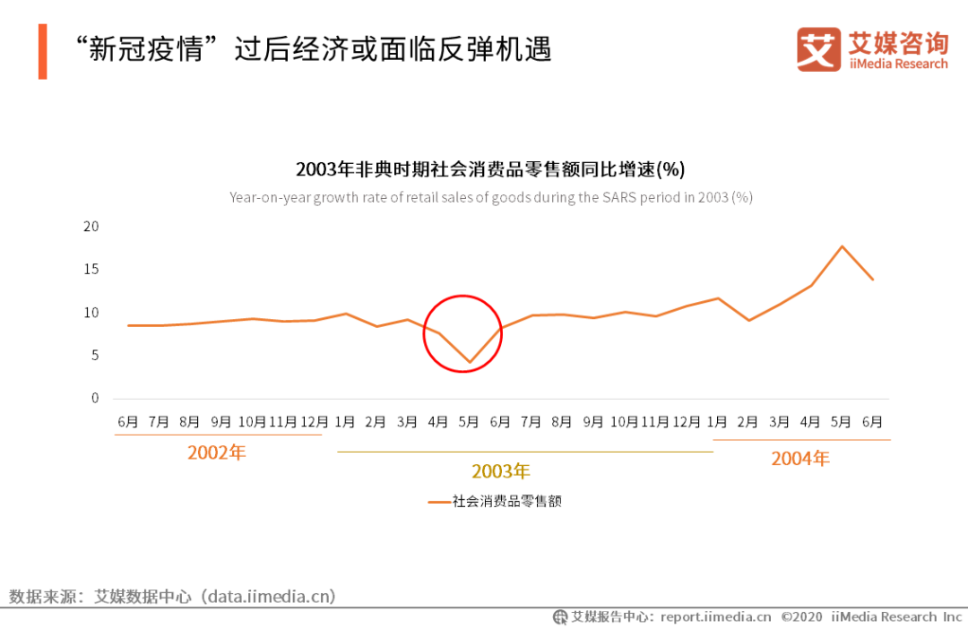 “新冠疫情”過后經濟或面臨反彈機遇 iiMedia Research(艾媒咨詢)數據顯示,2003年非典疫情結束后社會消費品零售額呈現快速反彈特點,迅速拉動經濟回位。艾媒咨詢分析師認為,2020“新冠疫情”過后,受到壓抑的社會消費或類似2003年非典疫情結束,出現經濟反彈現象,企業貸款需求增多,金融企業也面臨更多的發展機遇。