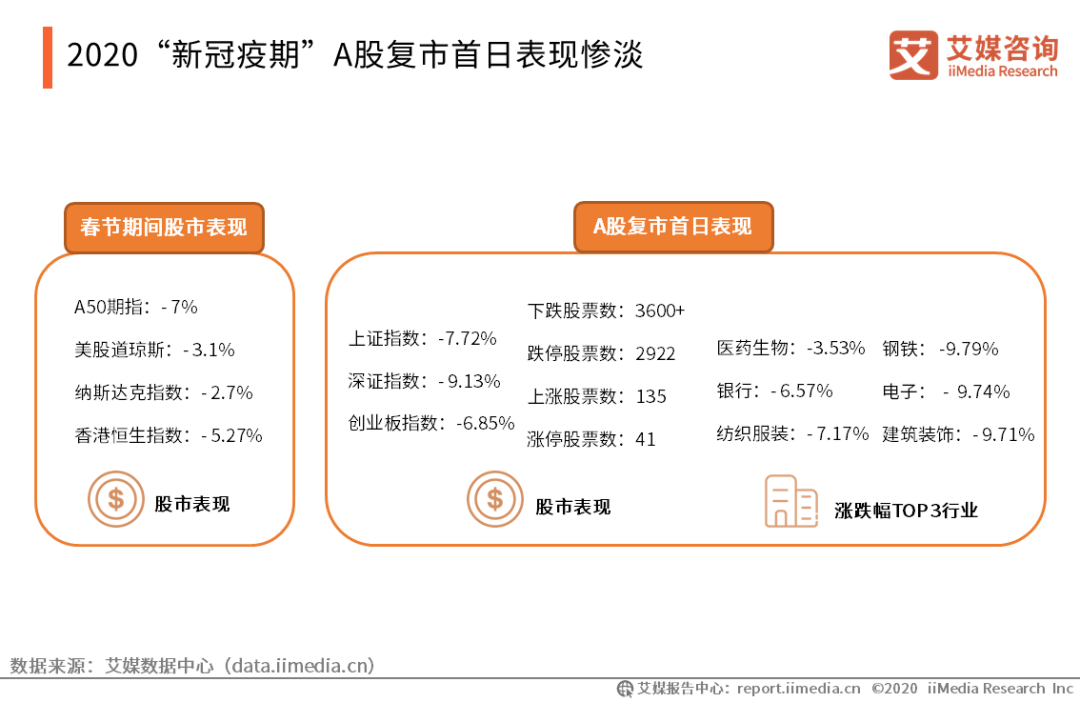 2020“新冠疫期”A股復市首日表現慘淡 iiMedia Research(艾媒咨詢)數據顯示,春節期間全球股市受疫情影響,均呈現下跌的態勢。2020年2月3日復市當日,滬深兩市超過3600只股票下跌,各大行業版塊均受到影響。其中醫藥生物行業跌幅最小,哈藥股份等醫藥股和泰達股份等口罩概念股漲停。鋼鐵、電子、建筑裝飾行業跌幅最大。