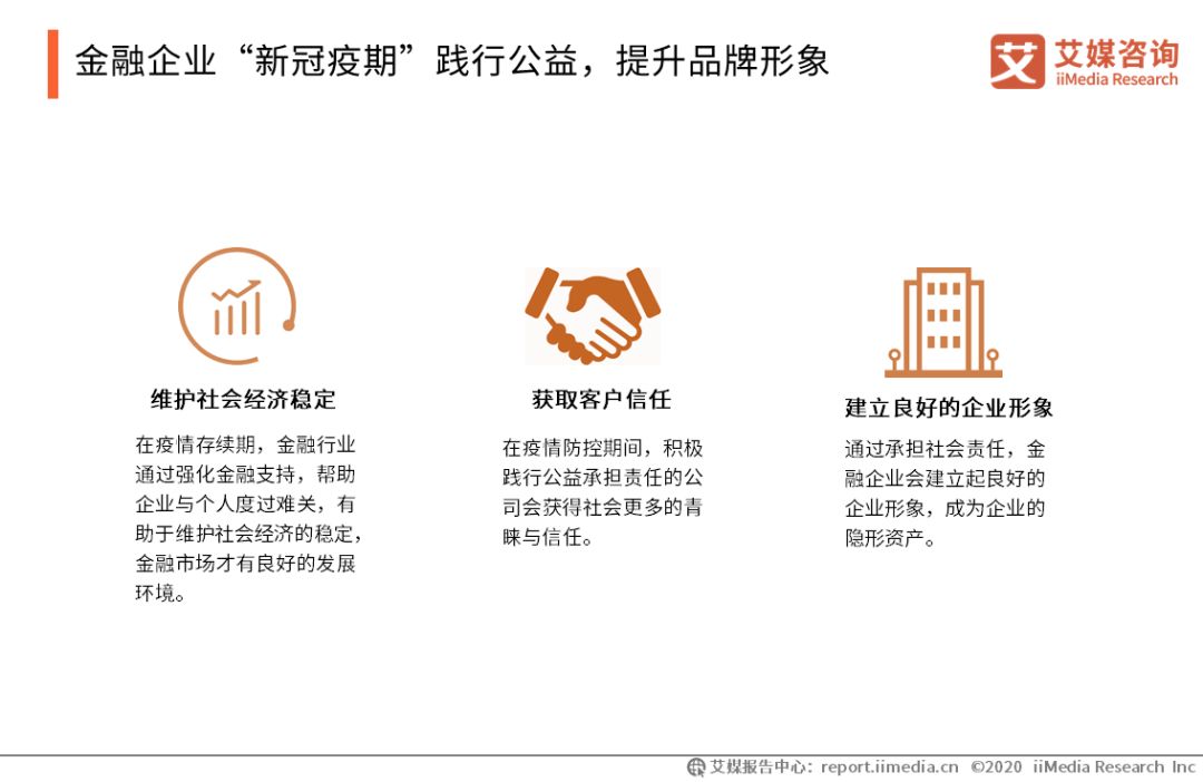 金融企業“新冠疫期”踐行公益,提升品牌形象 2020“新冠疫期”金融企業在規范運營的同時也有不少公益舉動,是疫情防范期間公益大軍中亮眼的一員。 艾媒咨詢分析師認為,金融企業踐行公益,展示社會責任感,有助于維護社會經濟穩定,獲取客戶信任以及建立良好的企業形象。疫情過后受到壓抑的社會經濟有望迎來反彈,而疫情期間建立起良好形象的企業,能更好獲取用戶信任,展現競爭力。