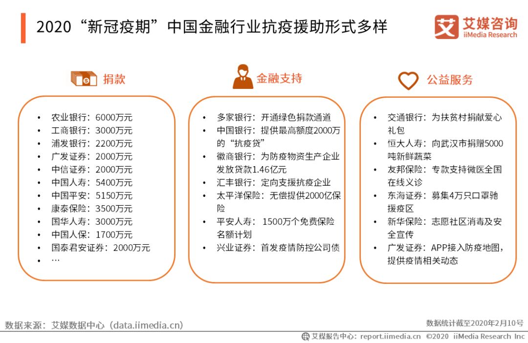2020“新冠疫期”中國金融行業抗疫援助形式多樣 2020“新冠疫期”,中國金融各行業公益援助行為多樣,除了定向捐款援助疫區外,更是結合自身資源條件提供多樣的公益服務進行支援,抗擊疫情。