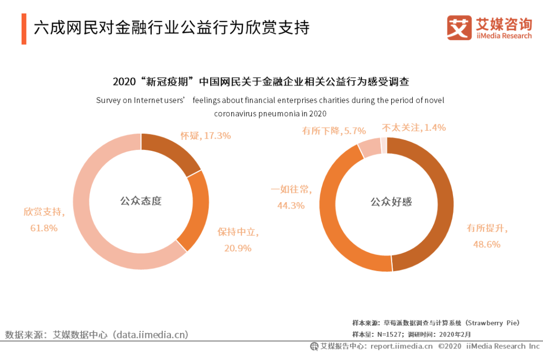 六成網民對金融行業公益行為欣賞支持 iiMedia Research(艾媒咨詢)數據顯示,2020“新冠疫期”內 61.8%的受訪網民對中國金融行業公益行為表示欣賞支持,48.6%的受訪網民對中國金融行業好感度有所提升。相關金融企業在疫情存續期間的公益表現,對自身品牌形象塑造有著顯著效果。
