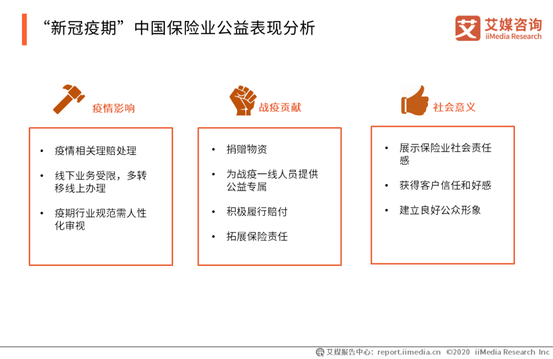 “新冠疫期”中國保險業公益表現分析 疫情的到來使得保險業的保險責任和相關理賠面臨不確定性,并且期間行業規范等問題廣受社會重視。艾媒咨詢分析師認為,中國銀行業在疫情防控期間的公益特色是發揮自身優勢條件,為戰斗在一線的醫護、媒體等人員提供公益保險,并在此期間擴展責任,是十分彰顯保險業社會責任感的舉措。