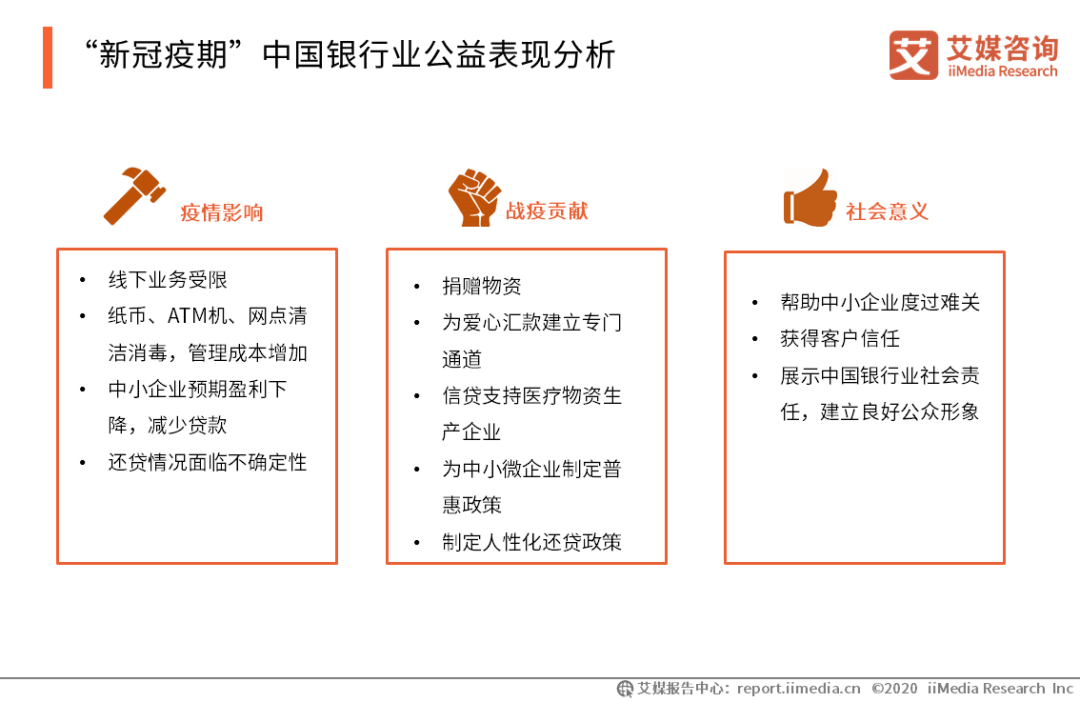 “新冠疫期”中國銀行業公益表現分析 在疫情存續期,銀行業的線下業務受到影響,而銀行網點、 ATM 、甚至紙幣的消毒需求使得銀行管理成本大大增加。艾媒咨詢分析師認為,中國銀行業在疫情防控期間的公益特色是整合資金資源,以信貸支持相關企業疫期生產,并制定系列普惠政策扶持中小微企業。