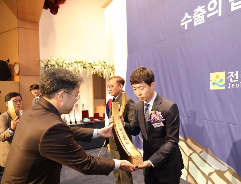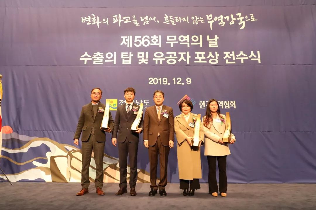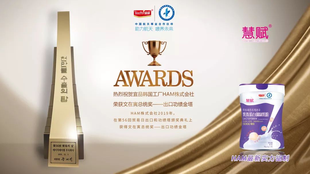 宜品慧賦乳鐵蛋白調(diào)制乳粉在本月正式亮相市場,遠(yuǎn)在韓國的生產(chǎn)工廠宜品HAMGLOBAL同時傳來了喜訊,為慧賦乳鐵蛋白的熱賣助力。 韓國總統(tǒng)金獎 2019年12月9日,在大韓民國全羅南道木浦市,由韓國全羅南道與韓國貿(mào)易協(xié)會聯(lián)合舉辦的第56回貿(mào)易日出口和功績塔頒獎典禮中,宜品HAM GLOBAL工廠斬獲韓國總統(tǒng)獎金獎,這也是宜品HAM GLOBAL第二次獲得總統(tǒng)獎。