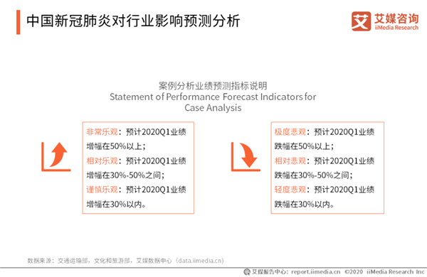 中國新冠肺炎對行業(yè)影響預(yù)測分析 非典期間的經(jīng)驗(yàn)表明,疫情對交運(yùn)行業(yè)沖擊較為持久,如 2003 年 6 月初非典疫情已基本得到控制,但 7-8 月國內(nèi)客運(yùn)量增速仍持續(xù)為負(fù),且全年交通運(yùn)輸、倉儲和郵政業(yè)GDP 增速較上年降低 1 個百分點(diǎn)。同時,2003 年非典疫情導(dǎo)致全年旅游收入同比下降 11.2%。鑒于2020年新冠肺炎疫情嚴(yán)重程度已經(jīng)超過2003年非典疫情,艾媒咨詢分析師認(rèn)為,新冠疫情對2020Q1行業(yè)經(jīng)濟(jì)將產(chǎn)生巨大影響,故設(shè)立六檔預(yù)測區(qū)間,僅做參考。