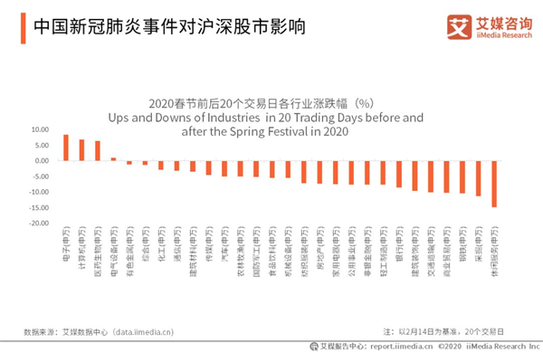 中國新冠肺炎事件對滬深股市影響 數(shù)據(jù)顯示,新冠肺炎爆發(fā)以來,滬深兩市反應(yīng)強(qiáng)烈。申萬28個一級行業(yè)春節(jié)前后20個交易日內(nèi)總體呈現(xiàn)漲少跌多態(tài)勢,其中電子、計(jì)算機(jī)、醫(yī)藥生物漲幅靠前,休閑服務(wù)行業(yè)跌幅最大,下跌近15%。艾媒咨詢分析師認(rèn)為,疫情之下,餐飲、旅游、交通運(yùn)輸?shù)刃袠I(yè)受損嚴(yán)重,而生鮮配送、在線醫(yī)療、在線辦公、在線教育、游戲娛樂等各類線上業(yè)務(wù)組成假期里的“宅經(jīng)濟(jì)”,在2020年初成為彎道超車的大熱風(fēng)口。