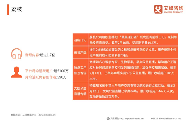 荔枝 作為“中國在線音頻第一股”,荔枝一直深耕音頻互動娛樂領(lǐng)域,若以UGC內(nèi)容數(shù)量口徑計(jì)算,荔枝是中國最大的UGC音頻社區(qū)。數(shù)據(jù)顯示,截至2019年11月30日,荔枝平臺已積累了超過1.7億音頻內(nèi)容。2019年10-11月期間,平臺月均活躍用戶數(shù)超5100萬, 月均活躍內(nèi)容創(chuàng)作者達(dá)到590萬,超過月均活躍用戶總數(shù)的11.4%,用戶平均月度互動次數(shù)約27億次。新冠疫情爆發(fā)以來,荔枝通過推出的多項(xiàng)運(yùn)營活動,促進(jìn)用戶活躍度進(jìn)一步上升。