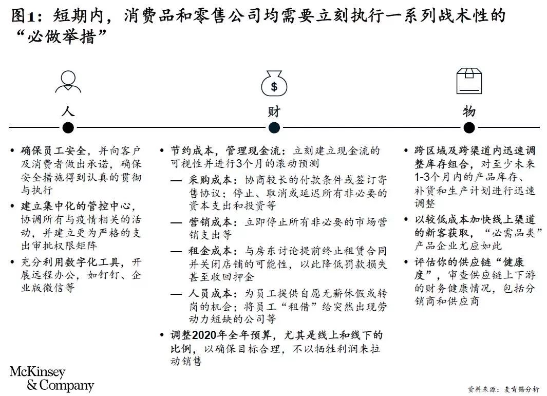 -01- 麥肯錫咨詢公司 近日,麥肯錫發(fā)布報告《消費品與零售企業(yè)的戰(zhàn)術(shù)戰(zhàn)略組合拳》中指出:此次疫情對零售行業(yè)的影響大于2003年SARS帶來的影響,但中國消費品和零售企業(yè)仍可通過迅速行動、打好戰(zhàn)術(shù)和戰(zhàn)略組合拳等方式,度過逆境。 麥肯錫認(rèn)為,鑒于消費在中國GDP中的占比大幅攀升,預(yù)計此次消費品與零售行業(yè)仍將首當(dāng)其沖,但對行業(yè)內(nèi)不同企業(yè)的影響程度不盡相同。 消費品企業(yè)與零售企業(yè)之間的影響差異:擁有雄厚實體店基礎(chǔ)和大量一線員工的零售商可能會面臨更大的財務(wù)壓力,尤其是人力成本及租金。而在華擁有龐大銷售團(tuán)隊和大量制造業(yè)務(wù)的消費品公司也將面臨同樣的壓力,但更主要集中在供應(yīng)鏈方面。 產(chǎn)品類別之間的影響差異:非剛需品類(如服裝和美容),企業(yè)面對的是驟降的客戶需求,及隨之而來的現(xiàn)金流壓力。如何最大程度地保留現(xiàn)金,保持公司的正常運營,并準(zhǔn)備疫情結(jié)束后的商業(yè)計劃以重新獲得客戶,恢復(fù)生意等,均是管理層們面臨的挑戰(zhàn)。 麥肯錫建議企業(yè)關(guān)注短期與中長期兩個方面。從短期而言,企業(yè)要采取一系列緊急戰(zhàn)術(shù)性舉措,克服陣痛;從中長期而言,企業(yè)應(yīng)著眼危機后的增長和復(fù)蘇戰(zhàn)略,放眼未來,積極布局 “新常態(tài)”,建立自身的競爭優(yōu)勢。
