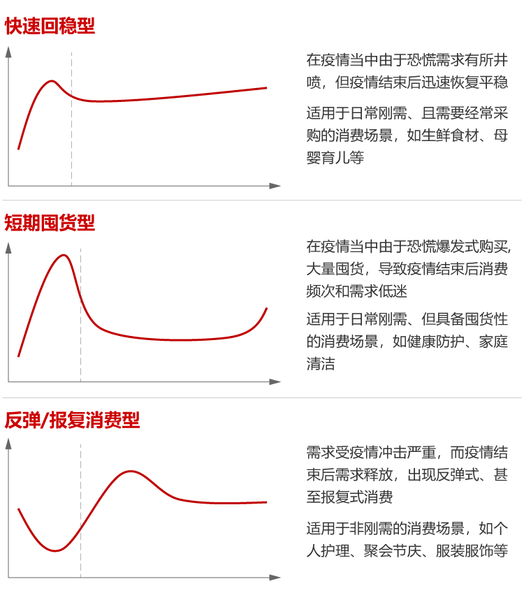 圖片來源:麥肯錫 中長期方面,麥肯錫認(rèn)為以下幾個方面可重點考慮: 1. 切實加快線上 /全渠道舉措的落地推廣。 2. 推出一套有針對性的收益管理計劃。 3. 重新思考供應(yīng)鏈戰(zhàn)略,優(yōu)化供應(yīng)鏈設(shè)計和運營。 -02- 貝恩公司 近日,公司貝恩公司發(fā)布的《疫情之后,零售企業(yè)的“危”與“機”》報告指出,回顧以往的疫情或自然災(zāi)害,零售市場一般會經(jīng)歷三個階段:沖擊、恢復(fù)和回穩(wěn)。 在疫情對消費者行為和偏好的影響方面,為了更好地進(jìn)行分析討論,我們將商品零售場景分為9大類,分別是:生鮮食材、休閑飲食、聚會節(jié)慶、母嬰育兒、個人護(hù)理、家庭清潔、健康防護(hù)、服裝服飾、電子電器。 貝恩發(fā)現(xiàn),不同場景在疫情結(jié)束后的需求模式和變化各不相同,大致可分為三類:
