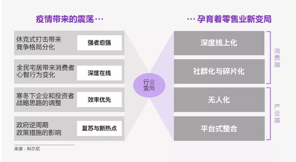 凱度咨詢在近日發(fā)布的《疫情之下,各行各業(yè)的危與機(二)——零售篇》文中指出,此次疫情對零售行業(yè)造成了直接沖擊,但便利店、無人店與自動販賣機等實體零售,各類電商,以及線上與線下的整合零售都出現(xiàn)了新的機遇。 以百貨與購物中心為例,凱度咨詢認(rèn)為:短期來看,由于疫情導(dǎo)致的客流減少會在不同程度上對實體百貨和購物中心的生意產(chǎn)生影響。而就長期而言,這可能是這些企業(yè)加快數(shù)字化轉(zhuǎn)型、加強線上推廣和新工具應(yīng)用、加快融合線上線下、充分挖掘會員數(shù)據(jù)的最佳契機。 線上商城、官方微信賬號、微信小程序等百貨或者購物中心自有線上平臺的重要性在今年將得到凸顯。 會員關(guān)系管理、數(shù)據(jù)深度挖掘、個性化產(chǎn)品以及促銷定制、實現(xiàn)高價值高質(zhì)量的會員和銷售增長將會成為核心策略。 體驗式消費依舊是線下消費的主旋律,不過,如何利用新技術(shù)打造沉浸式線上購物體驗也是值得探討的一個話題。 凱度咨詢指出,從短期來看,部分渠道與業(yè)態(tài)的消費需求提升明顯;就長期而言,這次挑戰(zhàn)對培養(yǎng)新的消費習(xí)慣、開啟新的藍(lán)海、促進(jìn)商業(yè)轉(zhuǎn)型與升級將起到重要的推動作用。 -05- 科爾尼(A.T. Kearney) 而管理咨詢公司科爾尼公司發(fā)布《海嘯之后,暗潮洶涌——疫情之后的零售業(yè)變局》中指出,零售行業(yè)是疫情打擊的重災(zāi)區(qū),對各業(yè)態(tài)、各品類的影響不盡相同。總體來說,有三大影響: 第一,線上影響弱于線下,生鮮電商變“危”為“機”。預(yù)計疫情之后,電商占社會消費品零售總額有望從當(dāng)前21%進(jìn)一步提升至24%或更高。 第二,近場受創(chuàng)小于遠(yuǎn)場。當(dāng)前,對于貼近社區(qū)的超市、便利店、社區(qū)生鮮店等“近場業(yè)態(tài)”來說,生鮮和生活必需品的核心需求依然強勁,負(fù)面影響主要來自一部分政策性閉店要求和防疫措施帶來的成本上升;而“遠(yuǎn)場業(yè)態(tài)”如購物中心、百貨、品類專業(yè)店、餐飲則普遍“休克”,現(xiàn)金流危機嚴(yán)重。 第三,大平臺韌性強于小平臺。在面對疫情的反應(yīng)速度、調(diào)度能力、運營彈性上,大平臺顯示出了更強的優(yōu)勢。由細(xì)微見大勢,疫情之后,行業(yè)洗牌會更加猛烈。