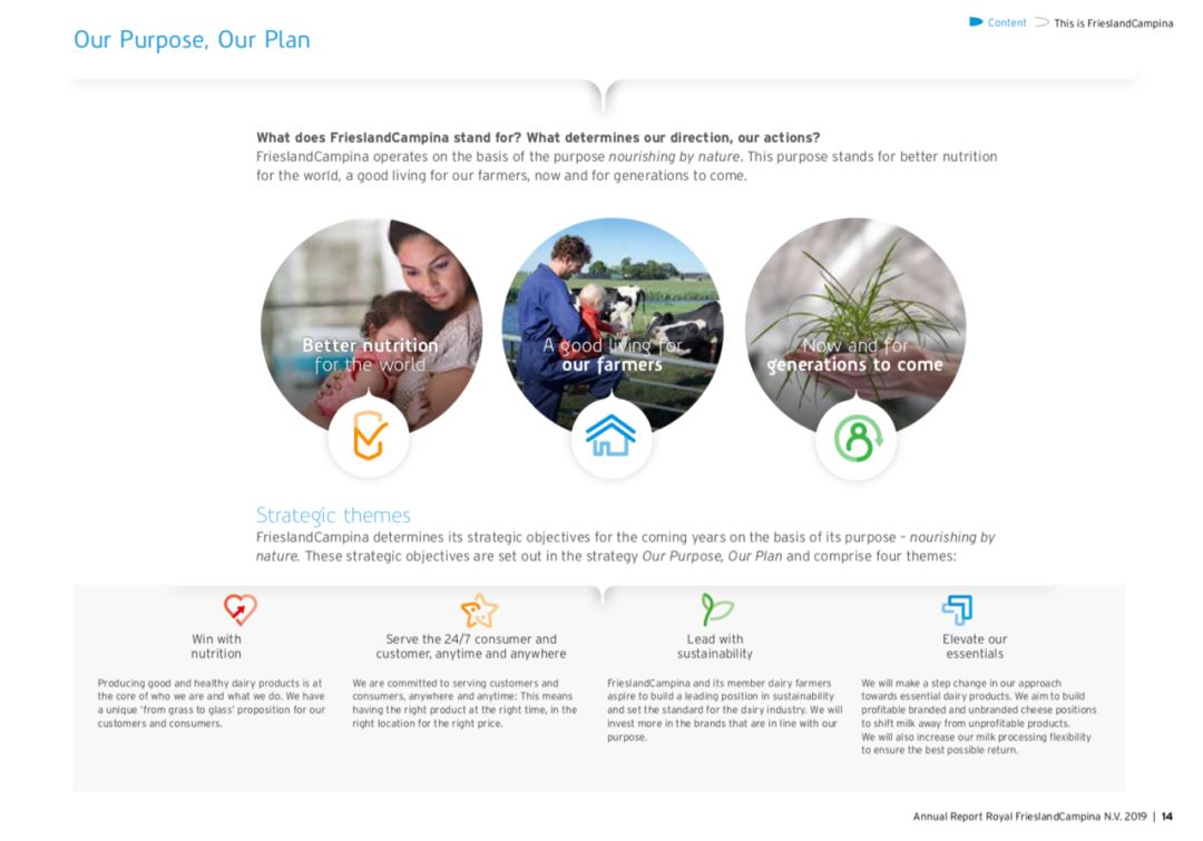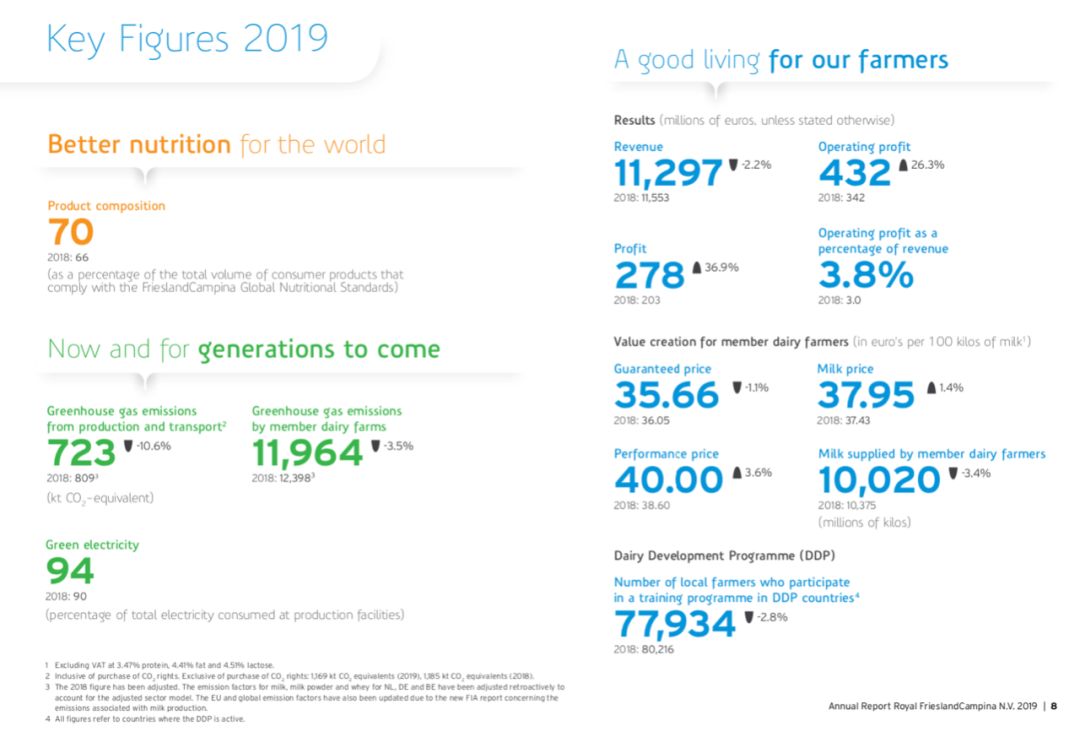 不過,司馬翰在年報中特別指出,菲仕蘭的營業利潤“與2018年相比有所改善”,2019年營業利潤增長26.3%,達到4.32億歐元(2018年:3.42億歐元)。撇開出售業務部門的一次性收益,營業利潤增長也達到了7%。 “增長的部分原因是全球品牌產品的收入增長了3.1%。我們致力于從基礎乳制品中獲取更多價值的努力也正在取得成果。此外,作為自2018年開始的轉型的一部分,我們更仔細地監控成本,從而節省了成本。”他說。 小食代翻看的資料顯示,此前在2018年10月底,菲仕蘭制定了“我們的目標,我們的計劃(Our Purpose, Our Plan)”戰略。該戰略包括四大主題:1)以營養品制勝,這包括中國內地和中國香港市場的嬰幼兒配方奶粉業務;2)24/7隨時隨地為消費者和客戶服務;3)引領可持續發展;4)提高產品價值。 “我們將逐步改變基礎乳制品業務。我們的目標是建立盈利的品牌和非品牌奶酪業務,而不再將牛奶用于生產無利可圖的產品。我們還將提高牛奶加工的靈活性,以確保獲得最佳回報。”該公司在談到提升產品價值時說道。