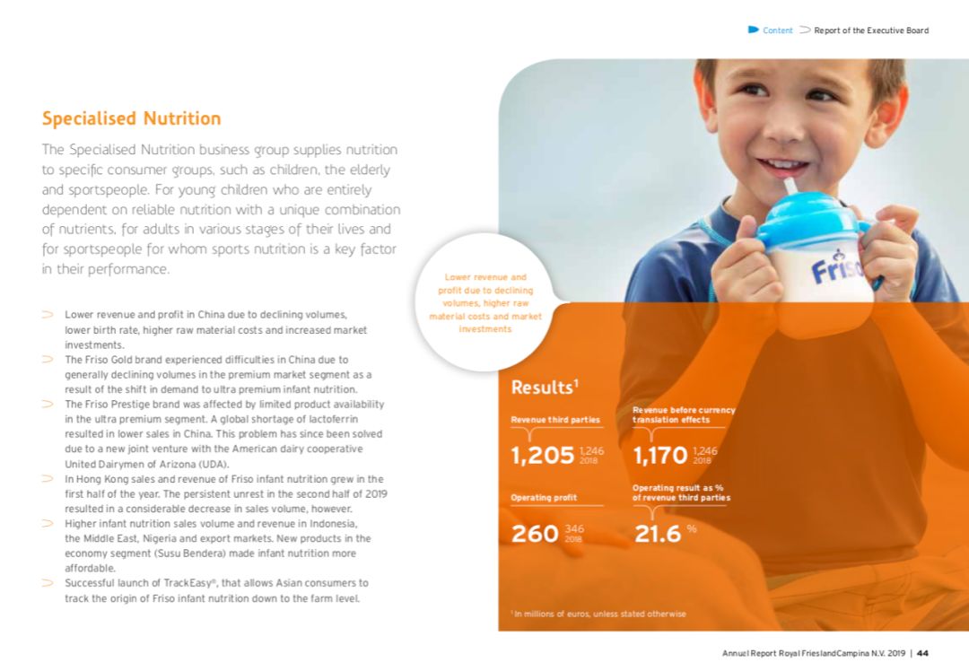 我們來重點看下專業營養品業務(注:包括美素佳兒等嬰幼兒配方奶粉,以及為老年人和運動人士提供的其他專業營養品)。 “由于銷量下降,出生率降低,原材料成本上升,以及市場投資增加,中國(的專業營養品業務)2019年的收入和利潤有所下滑。”菲仕蘭在年報中說。 菲仕蘭表示,美素佳兒金裝嬰幼兒配方奶粉的銷售在中國遇到困難,原因是消費需求向超高端嬰幼兒配方奶粉轉移,高端市場的銷量普遍下降。 而在超高端細分市場,皇家美素佳兒嬰幼兒配方奶粉則由于全球乳鐵蛋白短缺,受到“產品供應有限”的影響,導致其在中國的銷售下降。不過,菲仕蘭又指出,此問題已得到解決,它與美國乳制品合作社United Dairymen of Arizona成立了新合資企業。
