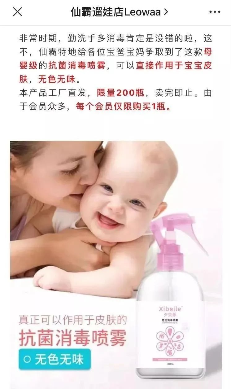 仙霸公司還通過與早教中心等機構線下異業結盟,進行玩具銷售合作。這些機構疫情期間同樣無法營業,通過向自身會員群推薦仙霸玩具套餐,售出后可得傭金。 此外,仙霸在這個消毒產品成為剛需的特殊時期,快速整合供應鏈資源,延展剛需產品銷售,推出“母嬰級”消毒產品,短時間內即被搶購一空。