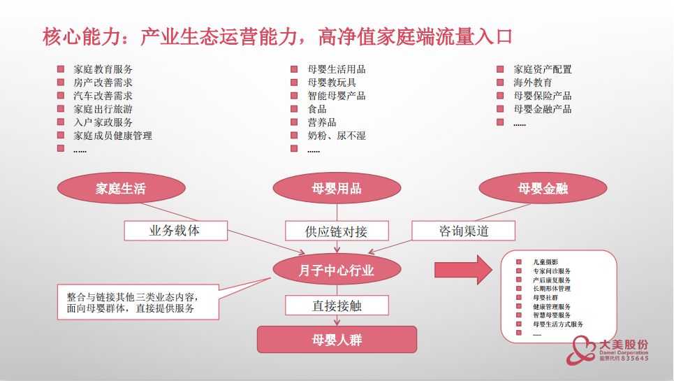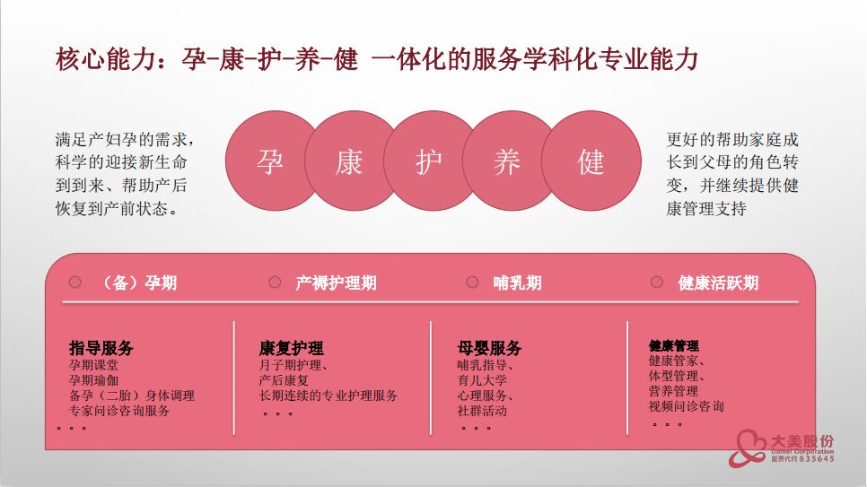 “我們月子會所絕對比很多餐廳影院KTV損失更大,疫情期間全封閉沒客流,不但沒收入之前簽的客人還都來退款,還不能關門,總不能把在住月子期的客人趕出去吧,只要有有一個住客,就要全體系運作。”一個月子會所老板在朋友圈無奈的說道,事實上,這個春節讓多數月子會所都受到了不同程度的影響。對于從業者來說,一方面,要想辦法彌補短期內的損失,同時從長遠看,月子會所該突破瓶頸提升抗風險能力與持續增長勢能,也是需要去深思的問題。 在近期母嬰行業觀察系列線上實戰大課中,大美股份龍飛就月子中心的服務業態特征與運營增長之道進行了干貨直播: 根據不完全統計全國有12000家月子中心,在發達的城市,占了70%左右的月子會所。在月子會所中分為幾種業態,大部分是加盟模式,也就是直營數量不多,但是有非常多的加盟商;大美股份采用直營店的模式,截止目前共有20家直營月子中心,分布在南京、南通、上海等一二線城市。 雖然月子會所發展比較快,但是有很多需要規范的地方: 1、沒有直接管理部門進行監督,監管缺位導致行業魚龍混雜; 2、月子會所行業缺少國家行業標準,導致同行服務專業水準參差不齊; 3、行業天花板明顯,門店數、床位數限制了企業發展上限。 月子中心行業的核心能力 一、孕-康-護-養-健一體化的學科化專業能力 當下中國已經開始在健康版塊加大力度,月子中心其實是健康版塊下的細分。