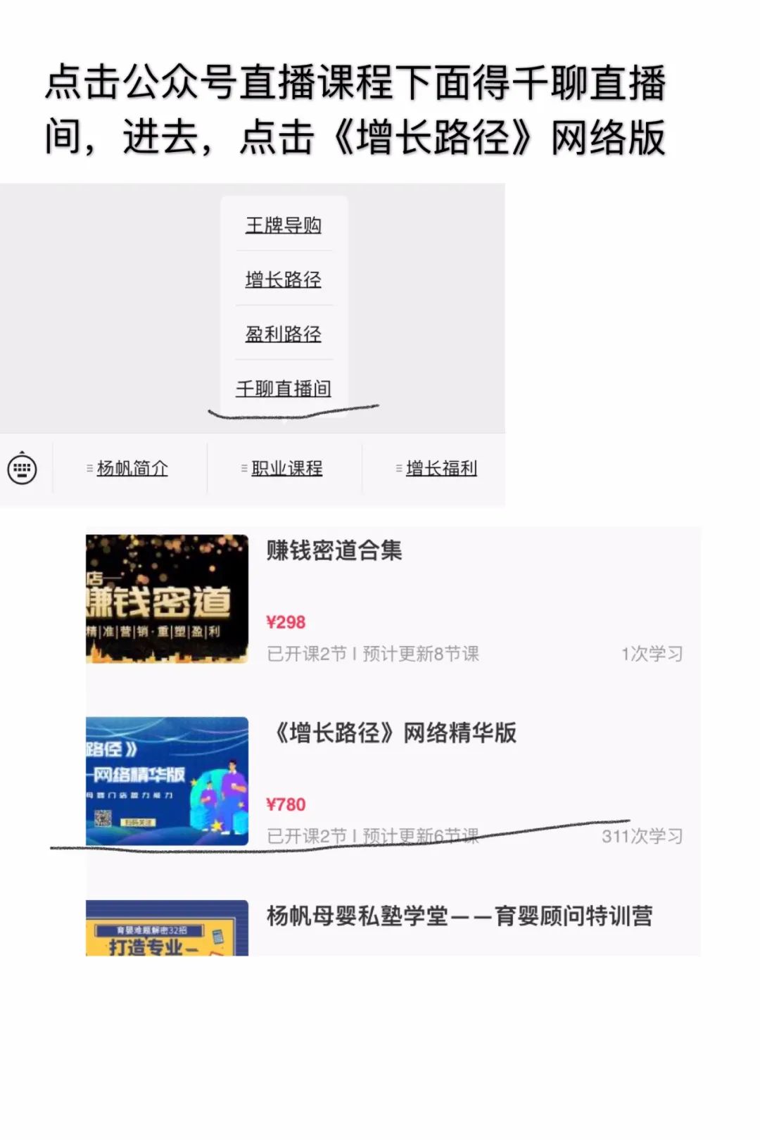 楊帆老師線下課程《增長路徑》終于搬到線上直播啦!!! 線下《增長路徑》課程自19年推出以來已經深度幫扶了全國上千家母嬰門店實現業績從點式增長到線式增長,學習是最好的轉運,學習的兩大核心: 第一:跟著一位老師堅持學習 第二:堅持學習就跟著行業內的第一名專家學 實現母嬰門店 業績指數級的爆破增長從線上《增長路徑》直播開始 方案一:經典門店引流 300元大禮包誘惑設計核心:讓顧客自己選擇自己超級喜歡的產品組合; 本方案亮點吸引力:顧客花200元購買(非常有吸引力的產品樂意購買); 本方案的點睛之筆:顧客轉介紹3-5個新客戶(數字根據門店實際情況調整)可以把花的200元返還到自己的賬戶繼續消費 本方案幫助門店的效果: 第①:弱化老客戶的轉介紹心理,成功激活老客戶的轉介紹。 第②:把新顧客,老顧客,門店三者利益緊緊的捆綁在一起