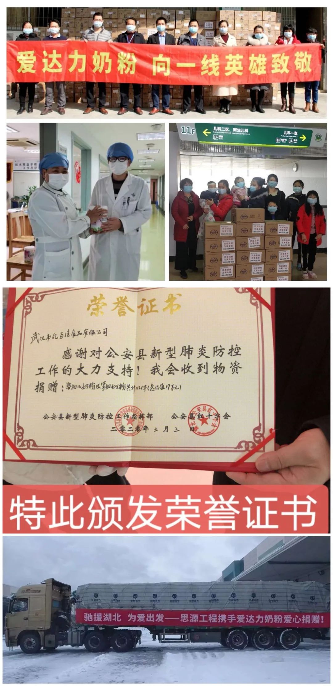 廣東億百公司,積極響應號召,疫情期間先后向湖北恩施福利院捐贈維愛佳奶粉1021罐,向湖北荊州慈善總會捐贈愛達力奶粉1356罐,向湖北公安縣紅十字會共計捐贈愛達力奶粉998罐,三批累計捐贈物資120多萬元。同時,向支援廣東、廣西、武漢、湖北黃岡、湖北隨州等多個地區(qū),涉及醫(yī)院、學校、幼兒園及社區(qū)等多家機構(gòu),捐贈愛心物資超1500萬元。以及向武漢雷神山醫(yī)院,湖北省婦幼保健院,西安國際醫(yī)學中心醫(yī)院武漢醫(yī)療隊愛心捐贈營養(yǎng)配方奶粉、紐貝樂品牌乳鐵蛋白、口罩等物資,總價值達200萬元。