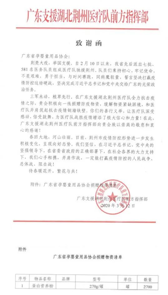綠臣公司委托協(xié)會聯(lián)絡廣東支援湖北荊州醫(yī)療隊前方指揮部,把捐贈湯臣倍健2700罐蛋白粉送給醫(yī)護人員,在協(xié)會陳新華執(zhí)行會長多方努力以及有關人士的幫助下,對接上廣東醫(yī)療隊指揮部成功把綠臣公司捐贈價值80萬物資成功發(fā)放給廣東一線醫(yī)護人員,增強醫(yī)護人員營養(yǎng)和免疫力起到很好的作用。近期收到指揮部致謝函!