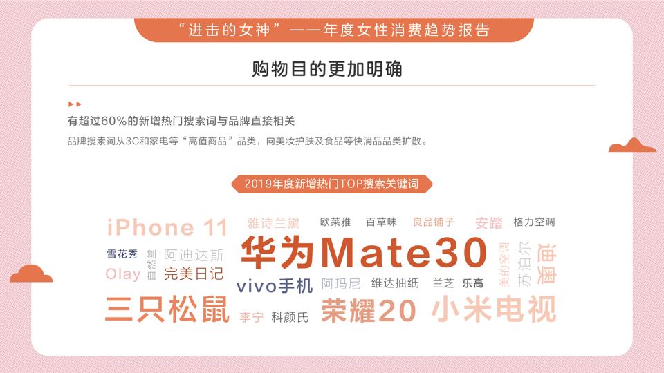 同時,有超過60%的新增熱門搜索詞與品牌直接相關,品牌搜索詞從3C和家電等“高值商品”品類,向美妝護膚及食品等快消品品類擴散。