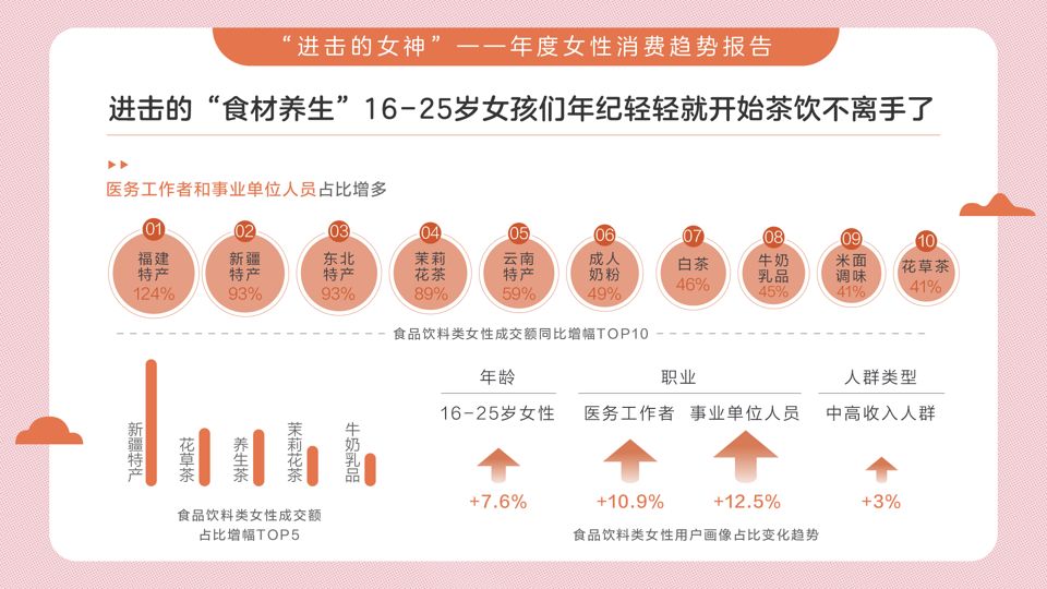 為了健康,不只是要運動,還要做好健康管理,“防患于未然”的女性消費者會主動對自己的健康進行管控,同時追逐完美狀態自我塑造。這也使得健康消費持續增長,比如抗氧化、補氣養血等商品熱銷,就是一個鮮明的表現。