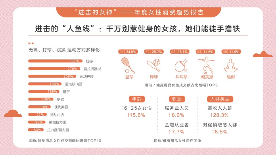京東大數據顯示,“擼鐵女孩”占比增多,她們在鍛煉的同時,也不忘購買護具。而在具體的運動形式上,“多樣化”是關鍵詞,無氧、打球、跳操等都受到她們的青睞。當然,我們也可以發現,隨著更多適合女性的商品投入市場,這些品類的女性消費占比將持續提升。